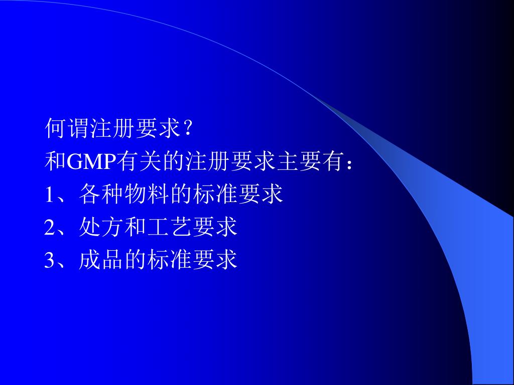 何谓注册要求? 和GMP有关的注册要求主要有: 1、各种物料的标准要求 2、处方和工艺要求 3、成品的标准要求