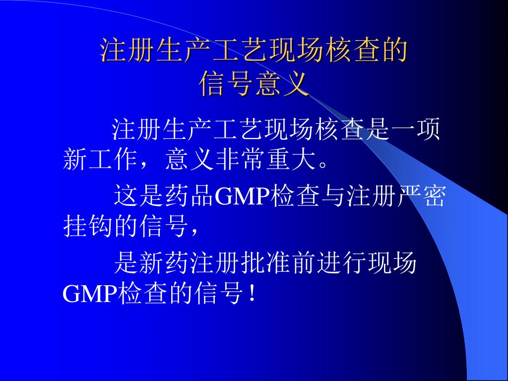 注册生产工艺现场核查的信号意义 注册生产工艺现场核查是一项新工作,意义非常重大。 这是药品GMP检查与注册严密挂钩的信号, 是新药注册批准前进行现场GMP检查的信号!