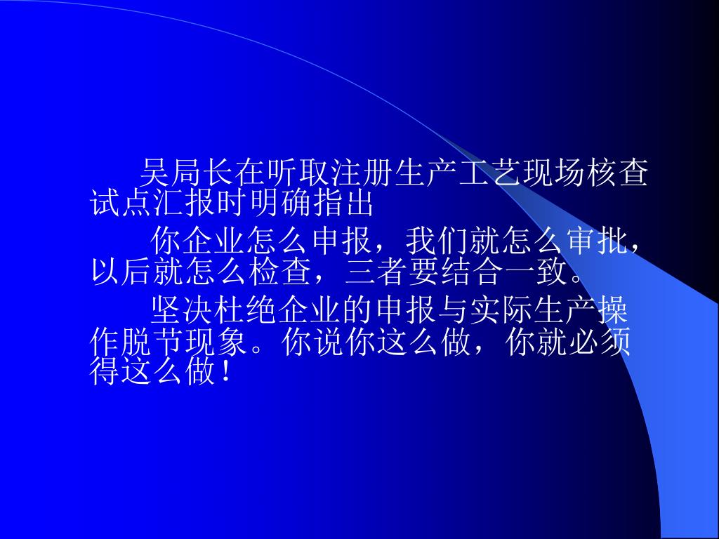 吴局长在听取注册生产工艺现场核查试点汇报时明确指出吴局长在听取注册生产工艺现场核查试点汇报时明确指出 你企业怎么申报,我们就怎么审批,以后就怎么检查,三者要结合一致。 坚决杜绝企业的申报与实际生产操作脱节现象。你说你这么做,你就必须得这么做!