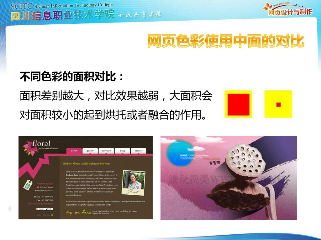 网页色彩使用中面的对比 不同色彩的面积对比: 面积差别越大,对比效果越弱,大面积会对面积较小的起到烘托或者融合的作用。