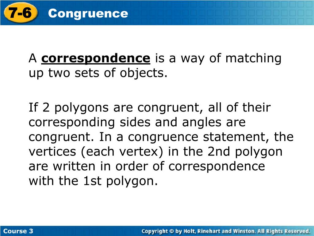 7-6 Congruence Course 3 A correspondence is a way of matching up two sets of objects. If 2 polygons are congruent, all of their corresponding sides and angles are congruent. In a congruence statement, the vertices (each vertex) in the 2nd polygon are written in order of correspondence with the 1st polygon.