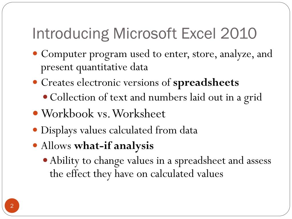 Introducing Microsoft Excel 2010 • Computer program used to enter, store, analyze, and present quantitative data • Creates electronic versions of spreadsheets • Collection of text and numbers laid out in a grid • Workbook vs. Worksheet • Displays values calculated from data • Allows what-if analysis • Ability to change values in a spreadsheet and assess the effect they have on calculated values