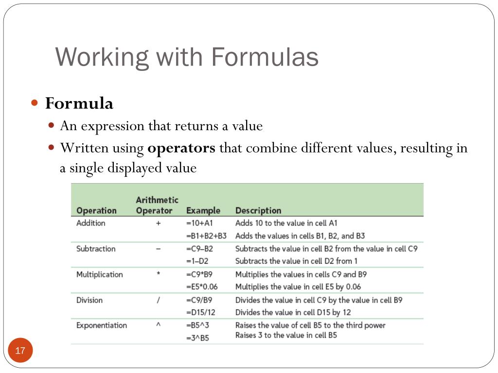 Working with Formulas • Formula • An expression that returns a value • Written using operators that combine different values, resulting in a single displayed value