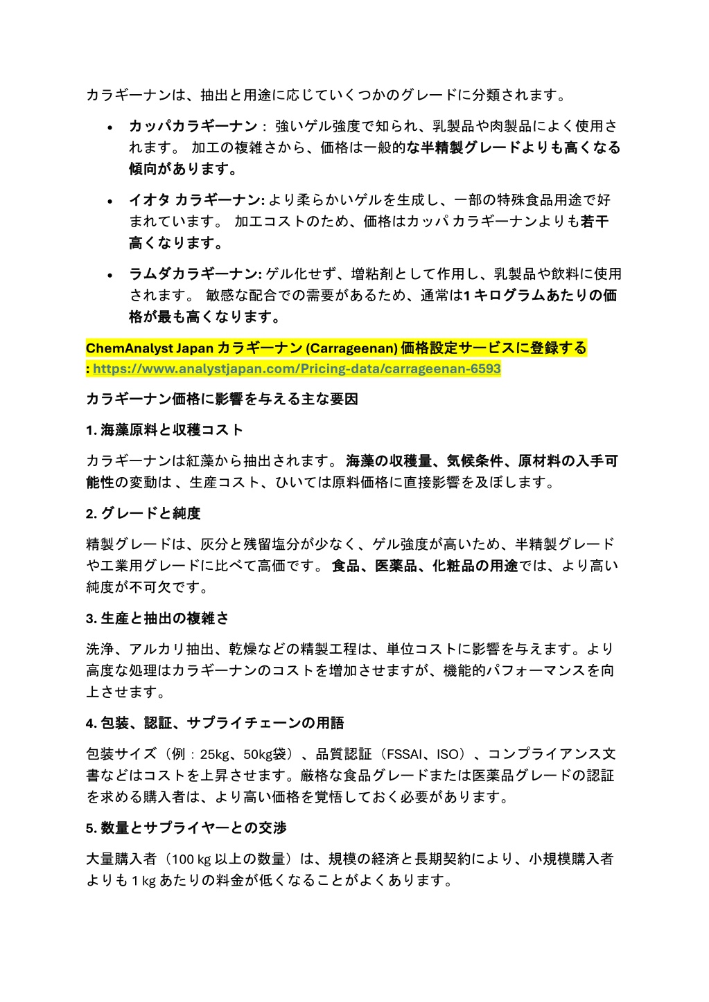 カラギーナンは、抽出と用途に応じていくつかのグレードに分類されます。カラギーナンは、抽出と用途に応じていくつかのグレードに分類されます。 •カッパカラギーナン: カッパカラギーナン:強いゲル強度で知られ、乳製品や肉製品によく使用さ れます。加工の複雑さから、価格は一般的な 傾向 傾向があります。 があります。 な半精製 半精製グレード グレードよりも よりも高 高くなる くなる •イオタ イオタカラギーナン カラギーナン:より柔らかいゲルを生成し、一部の特殊食品用途で好 まれています。加工コストのため、価格はカッパカラギーナンよりも若干 高 高くなります。 くなります。 若干 •ラムダカラギーナン ラムダカラギーナン:ゲル化せず、増粘剤として作用し、乳製品や飲料に使用 されます。敏感な配合での需要があるため、通常は1 キログラム 格 格が が最 最も も高 高くなります。 くなります。 キログラムあたりの あたりの価 価 ChemAnalyst Japanカラギーナン :https://www.analystjapan.com/Pricing-data/carrageenan-6593 カラギーナン (Carrageenan)価格設定 価格設定サービス サービスに に登録 登録する する な要因 要因 カラギーナン カラギーナン価格 価格に に影響 影響を を与 与える える主 主な 1. 海藻原料 海藻原料と コスト と収穫 収穫コスト カラギーナンは紅藻から抽出されます。海藻 能性 能性の変動は、生産コスト、ひいては原料価格に直接影響を及ぼします。 海藻の の収穫量、気候条件、原材料 収穫量、気候条件、原材料の の入手可 入手可 2. グレード グレードと と純度 純度 精製グレードは、灰分と残留塩分が少なく、ゲル強度が高いため、半精製グレード や工業用グレードに比べて高価です。食品、医薬品、化粧品 食品、医薬品、化粧品の 純度が不可欠です。 の用途 用途では、より高い 3. 生産 生産と さ と抽出 抽出の の複雑 複雑さ 洗浄、アルカリ抽出、乾燥などの精製工程は、単位コストに影響を与えます。より 高度な処理はカラギーナンのコストを増加させますが、機能的パフォーマンスを向 上させます。 4. 包装、認証、 包装、認証、サプライチェーン サプライチェーンの の用語 用語 包装サイズ(例:25kg、50kg袋)、品質認証(FSSAI、ISO)、コンプライアンス文 書などはコストを上昇させます。厳格な食品グレードまたは医薬品グレードの認証 を求める購入者は、より高い価格を覚悟しておく必要があります。 5. 数量 数量と 交渉 とサプライヤー サプライヤーとの との交渉 大量購入者(100 kg 以上の数量)は、規模の経済と長期契約により、小規模購入者 よりも 1 kg あたりの料金が低くなることがよくあります。