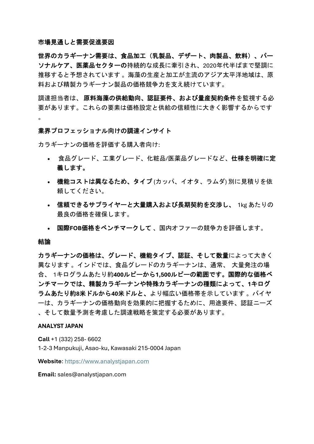 しと需要促進要因 需要促進要因 市場見通 市場見通しと 世界 世界の は、食品加工(乳製品、 食品加工(乳製品、デザート、 の持続的な成長に牽引され、2020年代半ばまで堅調に 推移すると予想されています。海藻の生産と加工が主流のアジア太平洋地域は、原 料および精製カラギーナン製品の価格競争力を支え続けています。 のカラギーナン カラギーナン需要 需要は、 デザート、肉製品、飲料)、 肉製品、飲料)、パー パー ソナルケア、 ソナルケア、医薬品 医薬品セクター セクターの 調達担当者は、原料海藻 要があります。これらの要素は価格設定と供給の信頼性に大きく影響するからです 。 原料海藻の の供給動向、認証要件、 供給動向、認証要件、および および量産契約条件 量産契約条件を監視する必 調達インサイト インサイト 業界 業界プロフェッショナル プロフェッショナル向 向けの けの調達 カラギーナンの価格を評価する購入者向け: •食品グレード、工業グレード、化粧品/医薬品グレードなど、仕様 義 義します。 します。 仕様を を明確 明確に に定 定 タイプ(カッパ、イオタ、ラムダ) 別に見積りを依 •機能 機能コスト 頼してください。 コストは は異 異なるため、 なるため、タイプ し、1kg あたりの •信頼 信頼できる 最良の価格を確保します。 できるサプライヤー サプライヤーと と大量購入 大量購入および および長期契約 長期契約を を交渉 交渉し、 •国際 国際FOB価格 して、国内オファーの競争力を評価します。 価格を をベンチマーク ベンチマークして 結論 結論 カラギーナン カラギーナンの 異なります。インドでは、食品グレードのカラギーナンは、通常、大量発注の場 合、 1キログラムあたり約400ルピー ルピーから から1,500ルピー ンチマーク ンチマークでは、 では、精製 精製カラギーナン カラギーナンや や特殊 特殊カラギーナン 約8米 米ドル ドルから から40米 米ドル ドルと、 と、より幅広い価格帯を示しています。バイヤ ーは、カラギーナンの価格動向を効果的に把握するために、用途要件、認証ニーズ 、そして数量予測を考慮した調達戦略を策定する必要があります。 の価格 価格は、 は、グレード、 グレード、機能 機能タイプ、 タイプ、認証、 認証、そして そして数量 数量によって大きく ルピーの の範囲 範囲です。 です。国際的 国際的な によって、1キログ な価格 価格ベ ベ カラギーナンの の種類 種類によって、 キログ ラム ラムあたり あたり約 ANALYST JAPAN Call+1 (332) 258- 6602 1-2-3 Manpukuji, Asao-ku, Kawasaki 215-0004 Japan Website:https://www.analystjapan.com Email:sales@analystjapan.com