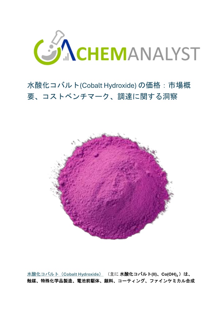 水酸化コバルト(Cobalt Hydroxide) の価格:市場概 要、コストベンチマーク、調達に関する洞察 水酸化 水酸化コバルト( コバルト(Cobalt Hydroxide) 触媒、特殊化学品製造、電池前駆体、顔料、 触媒、特殊化学品製造、電池前駆体、顔料、コーティング、ファインケミカル )(主に水酸化 水酸化コバルト コバルト(II)、 コーティング、ファインケミカル合成 、Co(OH)₂ )は、 )は、 合成