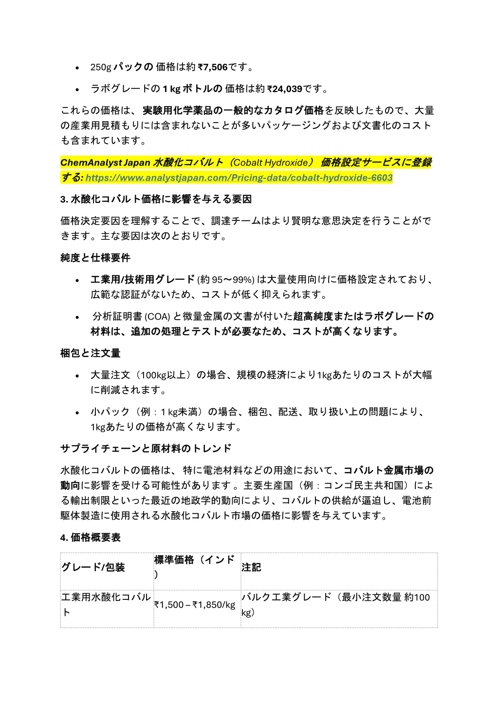 •250gパック の価格は約₹7,506です。 パックの •ラボグレードの1 kg ボトル の価格は約₹24,039です。 ボトルの これらの価格は、実験用化学薬品 の産業用見積もりには含まれないことが多いパッケージングおよび文書化のコスト も含まれています。 実験用化学薬品の の一般的 一般的な なカタログ カタログ価格 価格を反映したもので、大量 ChemAnalyst Japan水酸化 する する:https://www.analystjapan.com/Pricing-data/cobalt-hydroxide-6603 水酸化コバルト( コバルト(Cobalt Hydroxide) )価格設定 価格設定サービス サービスに に登録 登録 3. 水酸化 水酸化コバルト 要因 コバルト価格 価格に に影響 影響を を与 与える える要因 価格決定要因を理解することで、調達チームはより賢明な意思決定を行うことがで きます。主な要因は次のとおりです。 と仕様要件 仕様要件 純度 純度と •工業用 工業用/技術用 広範な認証がないため、コストが低く抑えられます。 技術用グレード グレード(約 95~99%) は大量使用向けに価格設定されており、 •分析証明書 (COA) と微量金属の文書が付いた超高純度 材料 材料は、 は、追加 追加の の処理 処理と とテスト テストが 超高純度または またはラボグレード ラボグレードの くなります。 の が必要 必要なため、 なため、コスト コストが が高 高くなります。 と注文量 注文量 梱包 梱包と •大量注文(100kg以上)の場合、規模の経済により1kgあたりのコストが大幅 に削減されます。 •小パック(例:1 kg未満)の場合、梱包、配送、取り扱い上の問題により、 1kgあたりの価格が高くなります。 のトレンド トレンド サプライチェーン サプライチェーンと と原材料 原材料の 水酸化コバルトの価格は、特に電池材料などの用途において、コバルト 動向 動向に影響を受ける可能性があります。主要生産国(例:コンゴ民主共和国)によ る輸出制限といった最近の地政学的動向により、コバルトの供給が逼迫し、電池前 駆体製造に使用される水酸化コバルト市場の価格に影響を与えています。 コバルト金属市場 金属市場の の 4. 価格概要表 価格概要表 標準価格( 標準価格(インド ) インド グレード グレード/包装 包装 注記 注記 ) ₹1,500 – ₹1,850/kgバルク工業グレード(最小注文数量約100 kg) 工業用水酸化コバル ト