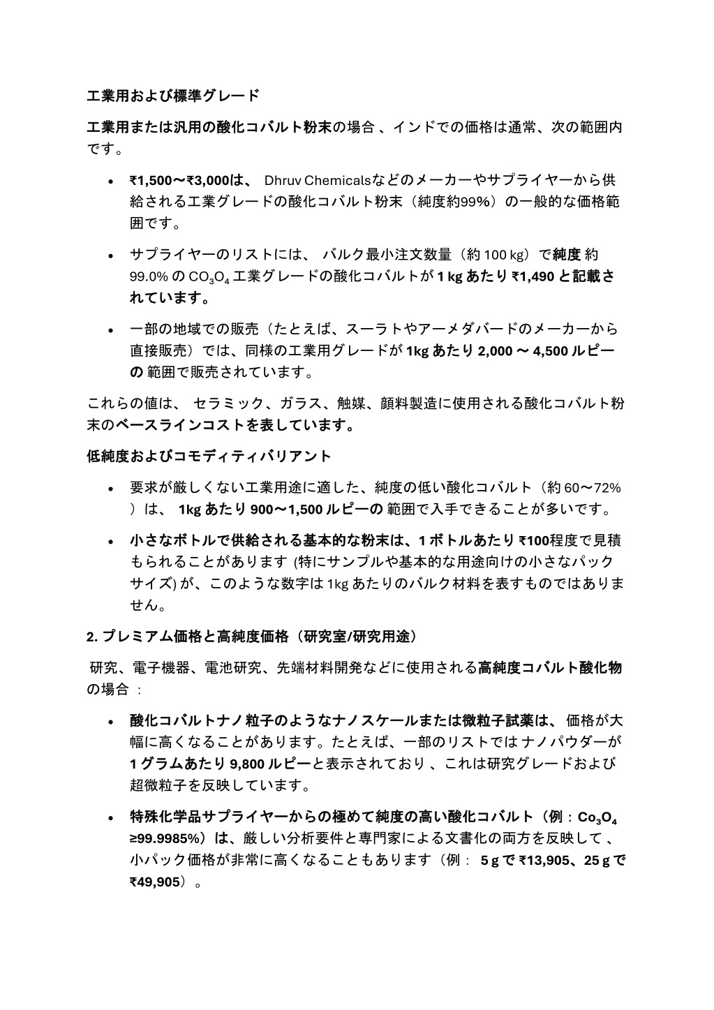 標準グレード グレード 工業用 工業用および および標準 粉末の場合、インドでの価格は通常、次の範囲内 工業用 工業用または です。 または汎用 汎用の の酸化 酸化コバルト コバルト粉末 •₹1,500~ 給される工業グレードの酸化コバルト粉末(純度約99%)の一般的な価格範 囲です。 ~₹3,000は、 は、Dhruv Chemicalsなどのメーカーやサプライヤーから供 •サプライヤーのリストには、バルク最小注文数量(約 100 kg)で純度 99.0% の CO₃O₄ 工業グレードの酸化コバルトが1 kg あたり れています。 れています。 純度約 と記載 記載さ あたり ₹1,490 と さ •一部の地域での販売(たとえば、スーラトやアーメダバードのメーカーから 直接販売)では、同様の工業用グレードが1kg あたり の の範囲で販売されています。 あたり 2,000 ~ ~ 4,500 ルピー ルピー これらの値は、セラミック、ガラス、触媒、顔料製造に使用される酸化コバルト粉 末のベースラインコスト ベースラインコストを を表 表しています。 しています。 およびコモディティバリアント コモディティバリアント 低純度 低純度および •要求が厳しくない工業用途に適した、純度の低い酸化コバルト(約 60~72% )は、1kg あたり あたり 900~ ~1,500 ルピー ルピーの の範囲で入手できることが多いです。 は、1 ボトル ボトルあたり あたり ₹100程度で見積 •小 小さな さなボトル もられることがあります(特にサンプルや基本的な用途向けの小さなパック サイズ) が、このような数字は 1kg あたりのバルク材料を表すものではありま せん。 ボトルで で供給 供給される される基本的 基本的な な粉末 粉末は、 2. プレミアム プレミアム価格 と高純度価格(研究室 高純度価格(研究室/研究用途) 研究用途) 価格と 研究、電子機器、電池研究、先端材料開発などに使用される高純度 の場合: 高純度コバルト コバルト酸化物 酸化物 は、価格が大 •酸化 酸化コバルトナノ コバルトナノ粒子 幅に高くなることがあります。たとえば、一部のリストではナノパウダーが 1 グラム グラムあたり あたり 9,800 ルピー ルピーと表示されており、これは研究グレードおよび 超微粒子を反映しています。 粒子のような のようなナノスケール ナノスケールまたは または微粒子試薬 微粒子試薬は、 例:Co₃O₄ •特殊化学品 特殊化学品サプライヤー ≥99.9985%)は 小パック価格が非常に高くなることもあります(例:5 g で ₹49,905)。 サプライヤーからの )は、厳しい分析要件と専門家による文書化の両方を反映して、 からの極 極めて めて純度 純度の の高 高い い酸化 酸化コバルト( コバルト(例: で ₹13,905、 、25 g で で