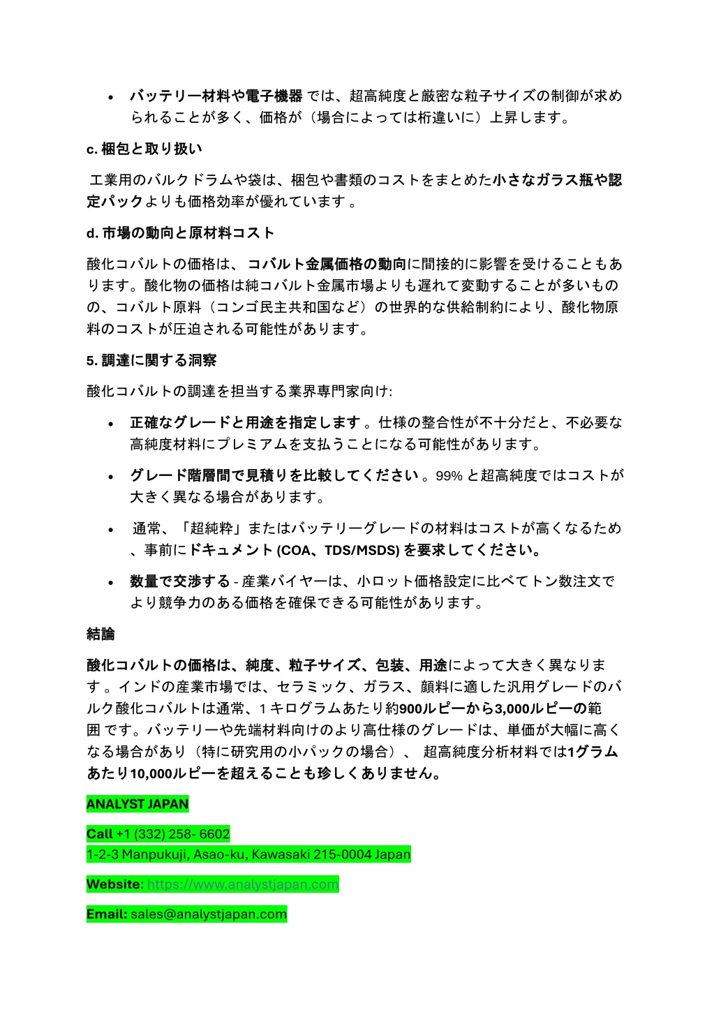 や電子機器 電子機器では、超高純度と厳密な粒子サイズの制御が求め •バッテリー バッテリー材料 られることが多く、価格が(場合によっては桁違いに)上昇します。 材料や c. 梱包 梱包と い と取 取り り扱 扱い 工業用のバルクドラムや袋は、梱包や書類のコストをまとめた小 定 定パック パックよりも価格効率が優れています。 小さな さなガラス ガラス瓶 瓶や や認 認 d. 市場 市場の コスト の動向 動向と と原材料 原材料コスト 酸化コバルトの価格は、コバルト ります。酸化物の価格は純コバルト金属市場よりも遅れて変動することが多いもの コバルト金属価格 金属価格の の動向 動向に間接的に影響を受けることもあ の、コバルト原料(コンゴ民主共和国など)の世界的な供給制約により、酸化物原 料のコストが圧迫される可能性があります。 5. 調達 調達に 洞察 に関 関する する洞察 酸化コバルトの調達を担当する業界専門家向け: します。仕様の整合性が不十分だと、不必要な •正確 正確な 高純度材料にプレミアムを支払うことになる可能性があります。 なグレード グレードと と用途 用途を を指定 指定します 比較してください してください。99% と超高純度ではコストが •グレード グレード階層間 大きく異なる場合があります。 階層間で で見積 見積りを りを比較 •通常、「超純粋」またはバッテリーグレードの材料はコストが高くなるため 、事前にドキュメント ドキュメント (COA、 、TDS/MSDS) を を要求 要求してください。 してください。 する- 産業バイヤーは、小ロット価格設定に比べてトン数注文で •数量 数量で より競争力のある価格を確保できる可能性があります。 で交渉 交渉する 結論 結論 酸化 酸化コバルト コバルトの す。インドの産業市場では、セラミック、ガラス、顔料に適した汎用グレードのバ ルク酸化コバルトは通常、1キログラムあたり約900ルピー 囲です。バッテリーや先端材料向けのより高仕様のグレードは、単価が大幅に高く なる場合があり(特に研究用の小パックの場合)、超高純度分析材料では1グラム あたり あたり10,000ルピー ルピーを を超 超えることも えることも珍 珍しくありません。 しくありません。 の価格 価格は、 は、純度、粒子 純度、粒子サイズ、 サイズ、包装、用途 包装、用途によって大きく異なりま から3,000ルピー ルピーから ルピーの の範 グラム ANALYST JAPAN Call+1 (332) 258- 6602 1-2-3 Manpukuji, Asao-ku, Kawasaki 215-0004 Japan Website:https://www.analystjapan.com Email:sales@analystjapan.com