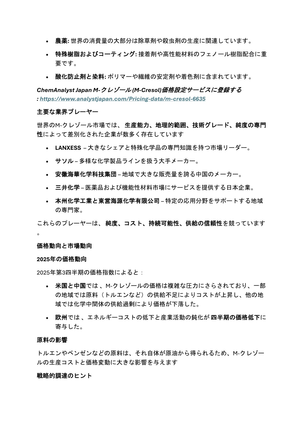 •農薬 農薬:世界の消費量の大部分は除草剤や殺虫剤の生産に関連しています。 およびコーティング コーティング:接着剤や高性能材料のフェノール樹脂配合に重 •特殊樹脂 特殊樹脂および 要です。 と染料 染料:ポリマーや繊維の安定剤や着色剤に含まれています。 •酸化防止剤 酸化防止剤と ChemAnalyst Japan M-クレゾール :https://www.analystjapan.com/Pricing-data/m-cresol-6635 クレゾール (M-Cresol)価格設定 価格設定サービス サービスに に登録 登録する する な業界 業界プレーヤー プレーヤー 主要 主要な 世界のM-クレゾール市場では、生産能力、地理的範囲、技術 性 性によって差別化された企業が数多く存在しています 生産能力、地理的範囲、技術グレード、 グレード、純度 純度の の専門 専門 •LANXESS– 大きなシェアと特殊化学品の専門知識を持つ市場リーダー。 •サソル サソル– 多様な化学製品ラインを扱う大手メーカー。 •安徽海華化学科技集団 安徽海華化学科技集団– 地域で大きな販売量を誇る中国のメーカー。 •三井化学 三井化学– 医薬品および機能性材料市場にサービスを提供する日本企業。 と東営海源化学有限公司 東営海源化学有限公司– 特定の応用分野をサポートする地域 •本州化学工業 本州化学工業と の専門家。 これらのプレーヤーは、純度、 。 純度、コスト、 コスト、持続可能性、供給 持続可能性、供給の の信頼性 信頼性を競っています と市場動向 市場動向 価格動向 価格動向と 2025年 の価格動向 価格動向 年の 2025年第3四半期の価格指数によると: と中国 中国では、M-クレゾールの価格は複雑な圧力にさらされており、一部 •米国 米国と の地域では原料(トルエンなど)の供給不足によりコストが上昇し、他の地 域では化学中間体の供給過剰により価格が下落した。 •欧州 欧州では、エネルギーコストの低下と産業活動の鈍化が四半期 寄与した。 四半期の の価格低下 価格低下に の影響 影響 原料 原料の トルエンやベンゼンなどの原料は、それ自体が原油から得られるため、M-クレゾー ルの生産コストと価格変動に大きな影響を与えます のヒント ヒント 戦略的調達 戦略的調達の