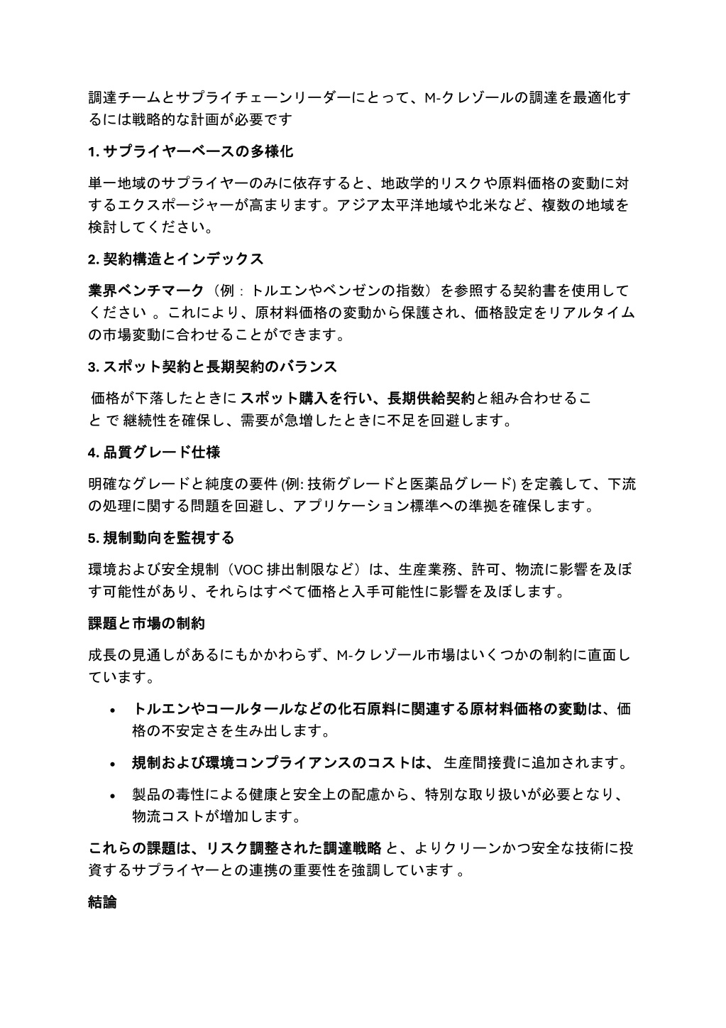 調達チームとサプライチェーンリーダーにとって、M-クレゾールの調達を最適化す調達チームとサプライチェーンリーダーにとって、M-クレゾールの調達を最適化す るには戦略的な計画が必要です 1. サプライヤーベース サプライヤーベースの の多様化 多様化 単一地域のサプライヤーのみに依存すると、地政学的リスクや原料価格の変動に対 するエクスポージャーが高まります。アジア太平洋地域や北米など、複数の地域を 検討してください。 2. 契約構造 契約構造と とインデックス インデックス 業界 業界ベンチマーク ベンチマーク(例:トルエンやベンゼンの指数)を参照する契約書を使用して ください。これにより、原材料価格の変動から保護され、価格設定をリアルタイム の市場変動に合わせることができます。 3. スポット スポット契約 のバランス バランス 契約と と長期契約 長期契約の 価格が下落したときにスポット とで継続性を確保し、需要が急増したときに不足を回避します。 スポット購入 購入を を行 行い、 い、長期供給契約 長期供給契約と組み合わせるこ 4. 品質 品質グレード グレード仕様 仕様 明確なグレードと純度の要件 (例: 技術グレードと医薬品グレード) を定義して、下流 の処理に関する問題を回避し、アプリケーション標準への準拠を確保します。 5. 規制動向 規制動向を する を監視 監視する 環境および安全規制(VOC 排出制限など)は、生産業務、許可、物流に影響を及ぼ す可能性があり、それらはすべて価格と入手可能性に影響を及ぼします。 の制約 制約 課題 課題と と市場 市場の 成長の見通しがあるにもかかわらず、M-クレゾール市場はいくつかの制約に直面し ています。 •トルエン トルエンや 格の不安定さを生み出します。 やコールタール コールタールなどの などの化石原料 化石原料に に関連 関連する する原材料価格 原材料価格の の変動 変動は は、価 は、生産間接費に追加されます。 •規制 規制および および環境 環境コンプライアンス コンプライアンスの のコスト コストは、 •製品の毒性による健康と安全上の配慮から、特別な取り扱いが必要となり、 物流コストが増加します。 調達戦略と、よりクリーンかつ安全な技術に投 これらの これらの課題 資するサプライヤーとの連携の重要性を強調しています。 課題は、 は、リスク リスク調整 調整された された調達戦略 結論 結論