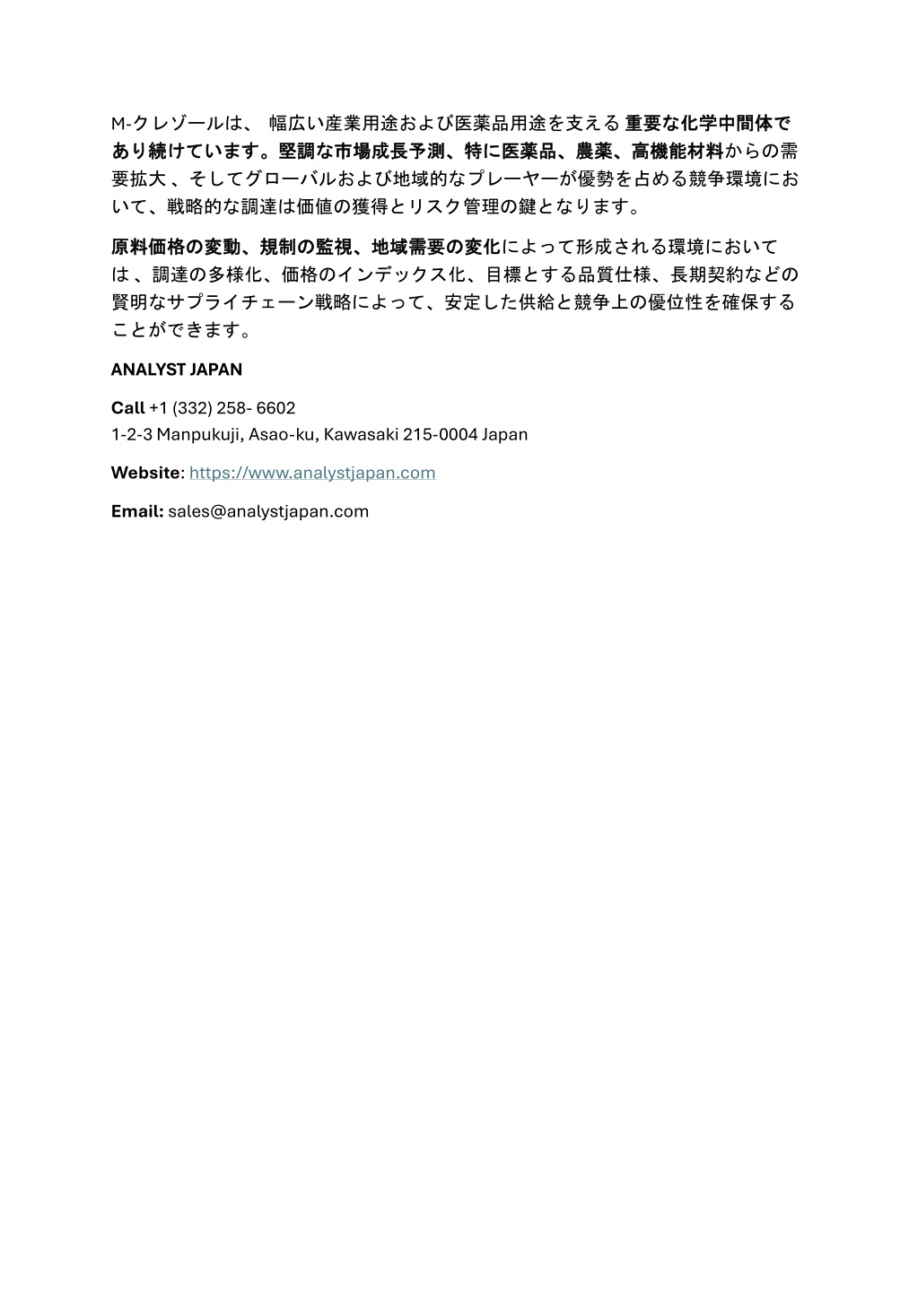 M-クレゾールは、幅広い産業用途および医薬品用途を支える重要M-クレゾールは、幅広い産業用途および医薬品用途を支える重要 あり あり続 続けています。 けています。堅調 堅調な な市場成長予測、特 市場成長予測、特に 要拡大、そしてグローバルおよび地域的なプレーヤーが優勢を占める競争環境にお いて、戦略的な調達は価値の獲得とリスク管理の鍵となります。 重要な な化学中間体 化学中間体で で に医薬品、農薬、高機能材料 医薬品、農薬、高機能材料からの需 原料価格 原料価格の は、調達の多様化、価格のインデックス化、目標とする品質仕様、長期契約などの 賢明なサプライチェーン戦略によって、安定した供給と競争上の優位性を確保する ことができます。 の変動、規制 変動、規制の の監視、地域需要 監視、地域需要の の変化 変化によって形成される環境において ANALYST JAPAN Call+1 (332) 258- 6602 1-2-3 Manpukuji, Asao-ku, Kawasaki 215-0004 Japan Website:https://www.analystjapan.com Email:sales@analystjapan.com