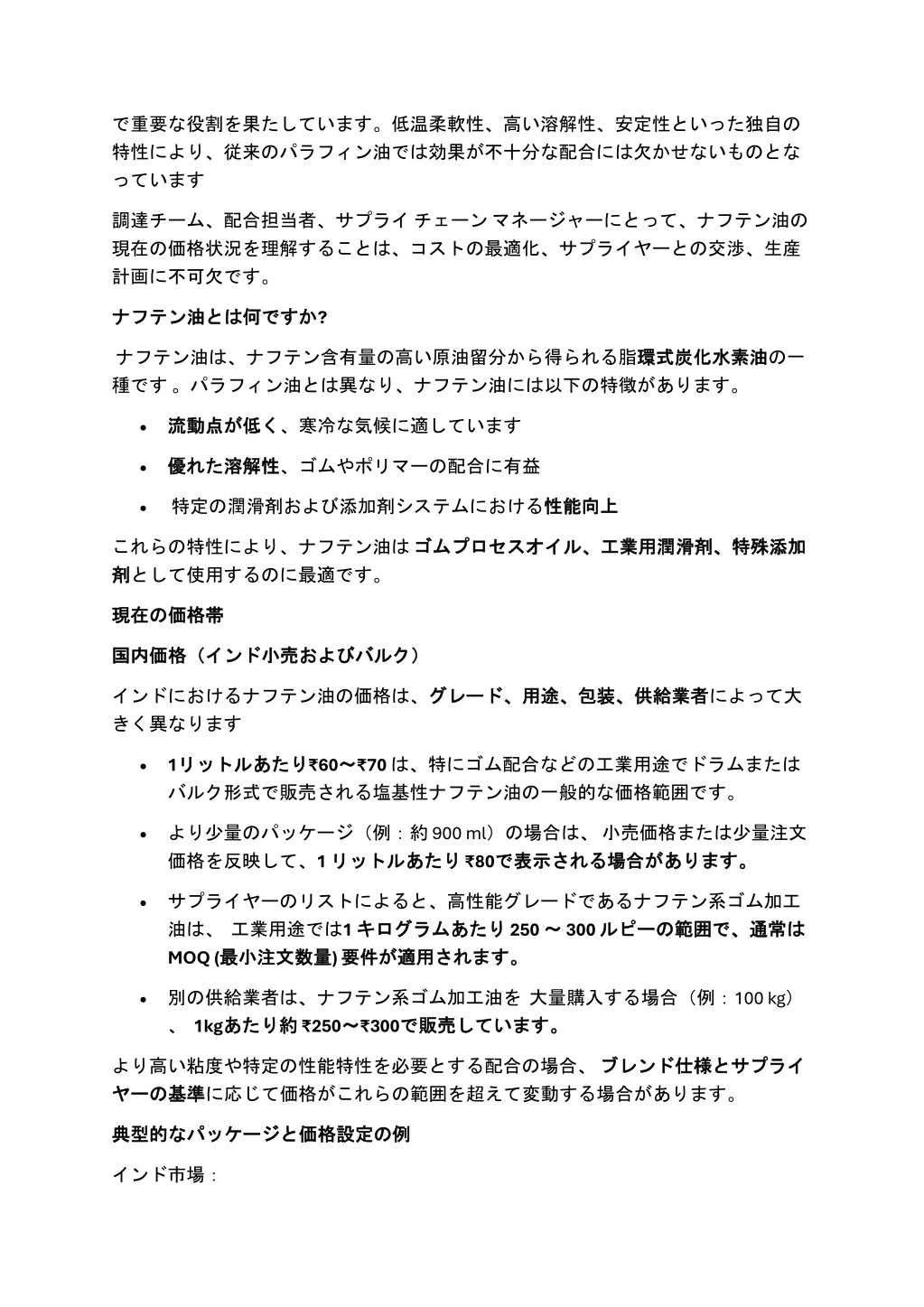 トル トルあたり あたり60~ ー ー以上になる場合があります。国際的なベンチマークによると、大量注文の場合 、バルクベースオイル バルクベースオイルの の価格 価格は は1kgあたり あたり1.25~ 市場需要によって変動します。 ~80ルピー ルピー程度 は1kgあたり あたり250~ ~300ルピ 程度ですが、 ですが、特殊 特殊な なゴム ゴム加工油 加工油は ルピ ~1.80ドル 程度ですが ですが、原油価格と ドル程度 業界の専門家や調達スペシャリストにとって、これらの価格動向と市場推進要因を 理解することは、効果的 効果的な な予算編成、調達戦略、 予算編成、調達戦略、および ます。 および製剤 製剤コスト コスト管理 管理の鍵となり ANALYST JAPAN Call+1 (332) 258- 6602 1-2-3 Manpukuji, Asao-ku, Kawasaki 215-0004 Japan Website:https://www.analystjapan.com Email:sales@analystjapan.com