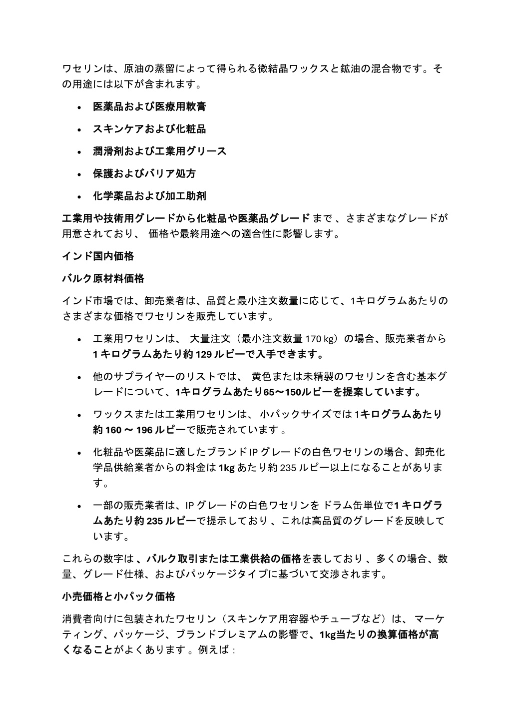 ワセリンは、原油の蒸留によって得られる微結晶ワックスと鉱油の混合物です。そワセリンは、原油の蒸留によって得られる微結晶ワックスと鉱油の混合物です。そ の用途には以下が含まれます。 および医療用軟膏 医療用軟膏 •医薬品 医薬品および 化粧品 •スキンケア スキンケアおよび および化粧品 工業用グリース グリース •潤滑剤 潤滑剤および および工業用 処方 •保護 保護および およびバリア バリア処方 および加工助剤 加工助剤 •化学薬品 化学薬品および や医薬品 医薬品グレード グレードまで、さまざまなグレードが 工業用 工業用や 用意されており、価格や最終用途への適合性に影響します。 や技術用 技術用グレード グレードから から化粧品 化粧品や インド インド国内価格 国内価格 バルク バルク原材料価格 原材料価格 インド市場では、卸売業者は、品質と最小注文数量に応じて、1キログラムあたりの さまざまな価格でワセリンを販売しています。 •工業用ワセリンは、大量注文(最小注文数量 170 kg)の場合、販売業者から 1 キログラム キログラムあたり あたり約 約 129 ルピー ルピーで で入手 入手できます。 できます。 •他のサプライヤーのリストでは、黄色または未精製のワセリンを含む基本グ レードについて、1キログラム キログラムあたり あたり65〜 〜150ルピー ルピーを を提案 提案しています。 しています。 •ワックスまたは工業用ワセリンは、小パックサイズでは 1キログラム 約 約 160 ~ ~ 196 ルピー ルピーで販売されています。 キログラムあたり あたり •化粧品や医薬品に適したブランド IP グレードの白色ワセリンの場合、卸売化 学品供給業者からの料金は1kgあたり約 235 ルピー以上になることがありま す。 •一部の販売業者は、IP グレードの白色ワセリンをドラム缶単位で1 キログラ ム ムあたり あたり約 約 235 ルピー ルピーで提示しており、これは高品質のグレードを反映して います。 キログラ これらの数字は、バルク 量、グレード仕様、およびパッケージタイプに基づいて交渉されます。 の価格 価格を表しており、多くの場合、数 、バルク取引 取引または または工業供給 工業供給の 価格 小売価格 小売価格と と小 小パック パック価格 消費者向けに包装されたワセリン(スキンケア用容器やチューブなど)は、マーケ ティング、パッケージ、ブランドプレミアムの影響で、 くなることがよくあります。例えば: 、1kg当 当たりの たりの換算価格 換算価格が が高 高 くなること