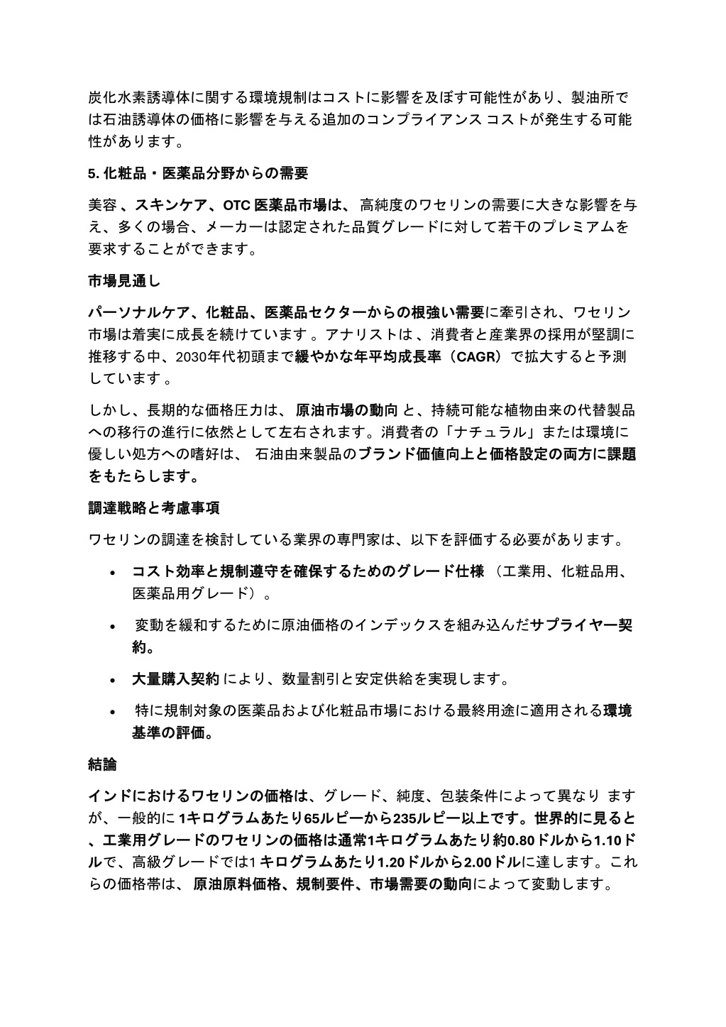 炭化水素誘導体に関する環境規制はコストに影響を及ぼす可能性があり、製油所で炭化水素誘導体に関する環境規制はコストに影響を及ぼす可能性があり、製油所で は石油誘導体の価格に影響を与える追加のコンプライアンスコストが発生する可能 性があります。 5. 化粧品・医薬品分野 化粧品・医薬品分野からの 需要 からの需要 美容、スキンケア、 、スキンケア、OTC 医薬品市場 え、多くの場合、メーカーは認定された品質グレードに対して若干のプレミアムを 要求することができます。 は、高純度のワセリンの需要に大きな影響を与 医薬品市場は、 し 市場見通 市場見通し パーソナルケア、 パーソナルケア、化粧品、医薬品 市場は着実に成長を続けています。アナリストは、消費者と産業界の採用が堅調に 推移する中、2030年代初頭まで緩 緩やかな やかな年平均成長率( 年平均成長率(CAGR) しています。 化粧品、医薬品セクター セクターからの からの根強 根強い い需要 需要に牽引され、ワセリン )で拡大すると予測 しかし、長期的な価格圧力は、原油市場 への移行の進行に依然として左右されます。消費者の「ナチュラル」または環境に 優しい処方への嗜好は、石油由来製品のブランド ブランド価値向上 をもたらします。 をもたらします。 の動向 動向と、持続可能な植物由来の代替製品 原油市場の 価値向上と と価格設定 価格設定の の両方 両方に に課題 課題 と考慮事項 考慮事項 調達戦略 調達戦略と ワセリンの調達を検討している業界の専門家は、以下を評価する必要があります。 仕様(工業用、化粧品用、 •コスト コスト効率 医薬品用グレード)。 効率と と規制遵守 規制遵守を を確保 確保するための するためのグレード グレード仕様 •変動を緩和するために原油価格のインデックスを組み込んだサプライヤー 約。 約。 サプライヤー契 契 •大量購入契約 大量購入契約により、数量割引と安定供給を実現します。 •特に規制対象の医薬品および化粧品市場における最終用途に適用される環境 基準 基準の の評価。 評価。 環境 結論 結論 は、グレード、純度、包装条件によって異なります キログラムあたり ルピーから から235ルピー 価格は は通常 通常1キログラム キログラムあたり キログラムあたり あたり1.20ドル ドルから インド インドにおける におけるワセリン が、一般的に1キログラム 、工業用 、工業用グレード グレードの ルで、高級グレードでは1キログラム らの価格帯は、原油原料価格、規制要件、市場需要 原油原料価格、規制要件、市場需要の ワセリンの の価格 価格は あたり65ルピー のワセリン ワセリンの の価格 ルピー以上 以上です。 です。世界的 約0.80ドル から2.00ドル ドルに達します。これ の動向 動向によって変動します。 世界的に に見 から1.10ド 見ると ると あたり約 ドルから ド ル
