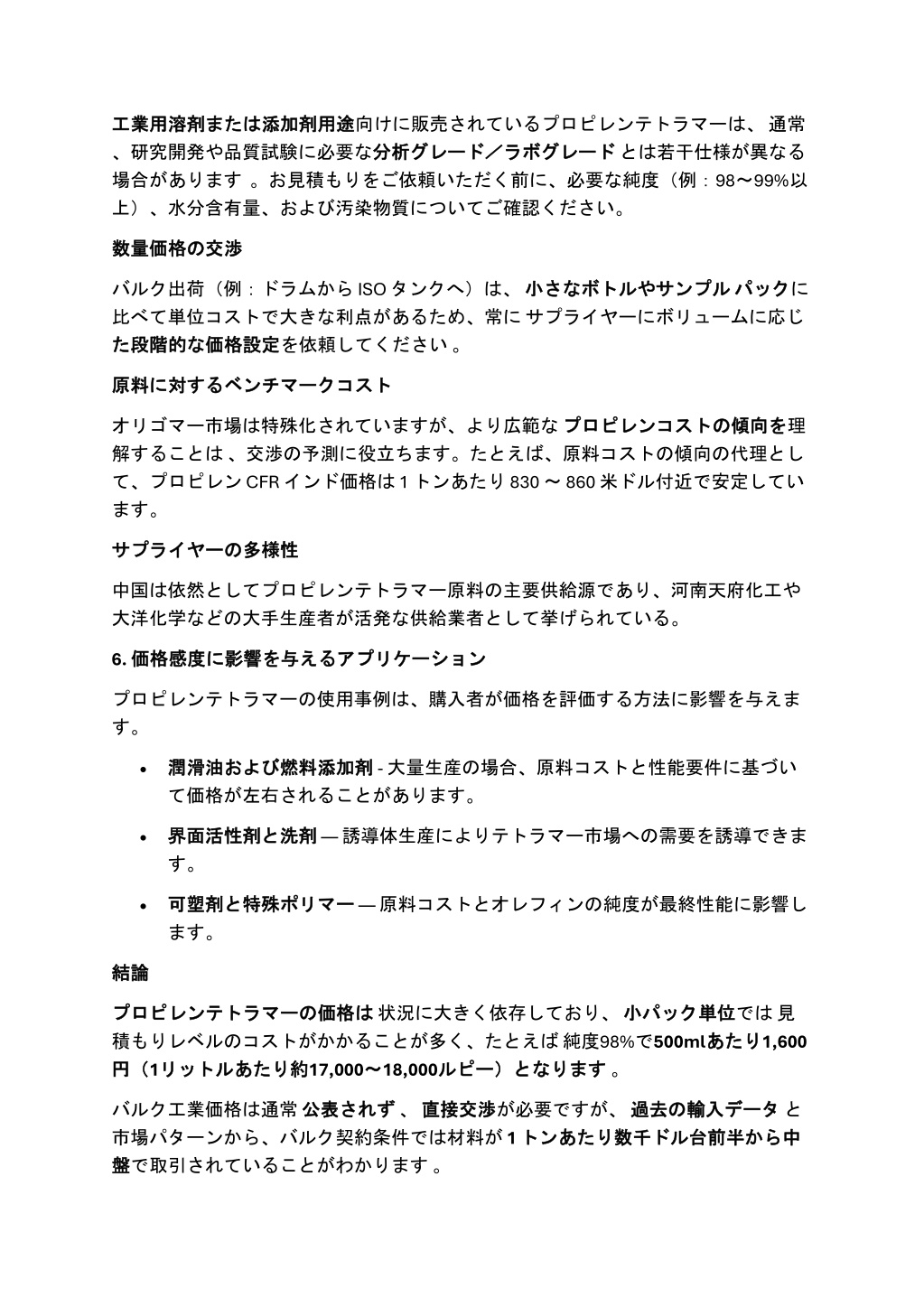 または添加剤用途 添加剤用途向けに販売されているプロピレンテトラマーは、通常 、研究開発や品質試験に必要な分析 分析グレード/ラボグレード グレード/ラボグレードとは若干仕様が異なる 場合があります。お見積もりをご依頼いただく前に、必要な純度(例:98~99%以 上)、水分含有量、および汚染物質についてご確認ください。 工業用溶剤 工業用溶剤または の交渉 交渉 数量価格 数量価格の バルク出荷(例:ドラムから ISO タンクへ)は、小 比べて単位コストで大きな利点があるため、常にサプライヤーにボリュームに応じ た た段階的 段階的な な価格設定 価格設定を依頼してください。 やサンプル サンプルパック 小さな さなボトル ボトルや パックに 対する するベンチマークコスト ベンチマークコスト 原料 原料に に対 オリゴマー市場は特殊化されていますが、より広範なプロピレンコスト 解することは、交渉の予測に役立ちます。たとえば、原料コストの傾向の代理とし て、プロピレン CFR インド価格は 1 トンあたり 830 ~ 860 米ドル付近で安定してい ます。 プロピレンコストの の傾向 傾向を を理 の多様性 多様性 サプライヤー サプライヤーの 中国は依然としてプロピレンテトラマー原料の主要供給源であり、河南天府化工や 大洋化学などの大手生産者が活発な供給業者として挙げられている。 6. 価格感度 価格感度に 与える えるアプリケーション アプリケーション に影響 影響を を与 プロピレンテトラマーの使用事例は、購入者が価格を評価する方法に影響を与えま す。 および燃料添加剤 燃料添加剤- 大量生産の場合、原料コストと性能要件に基づい •潤滑油 潤滑油および て価格が左右されることがあります。 と洗剤 洗剤— 誘導体生産によりテトラマー市場への需要を誘導できま •界面活性剤 界面活性剤と す。 と特殊 特殊ポリマー ポリマー— 原料コストとオレフィンの純度が最終性能に影響し •可塑剤 可塑剤と ます。 結論 結論 は状況に大きく依存しており、小 単位では見 あたり1,600 プロピレンテトラマー プロピレンテトラマーの 積もりレベルのコストがかかることが多く、たとえば純度98%で500mlあたり 円( 円(1リットル リットルあたり あたり約 約17,000~ ~18,000ルピー) の価格 価格は 小パック パック単位 ルピー)となります となります。 バルク工業価格は通常公表 市場パターンから、バルク契約条件では材料が1 トン 盤 盤で取引されていることがわかります。 公表されず されず、直接交渉 直接交渉が必要ですが、過去 トンあたり データと 台前半から から中 過去の の輸入 輸入データ あたり数千 数千ドル ドル台前半 中