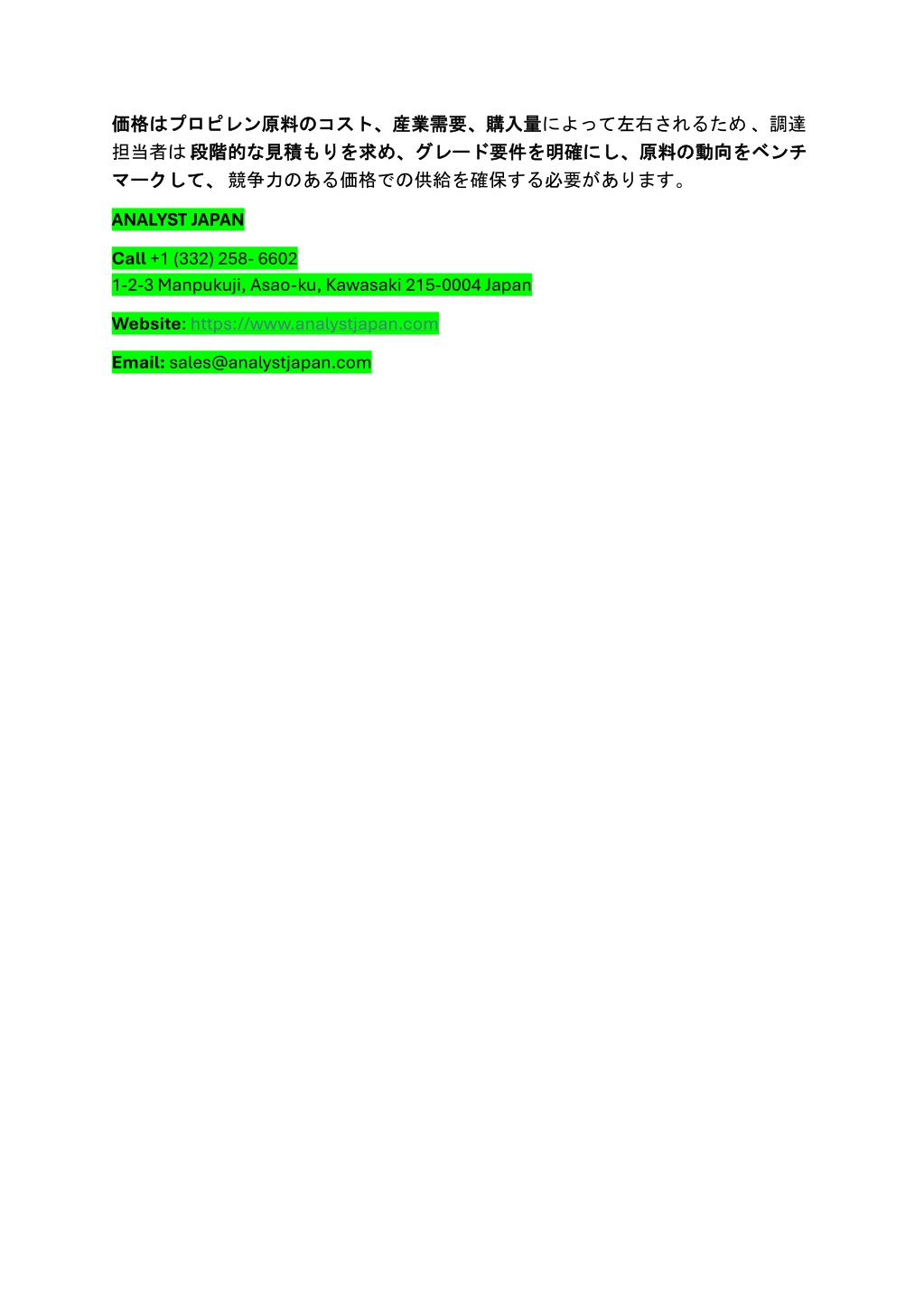 のコスト、 コスト、産業需要、購入量 産業需要、購入量によって左右されるため、調達 な見積 見積もりを もりを求 求め、 め、グレード グレード要件 要件を 価格 価格は 担当者は段階的 マーク マークして、 して、競争力のある価格での供給を確保する必要があります。 はプロピレン プロピレン原料 原料の 段階的な を明確 明確にし、 にし、原料 原料の の動向 動向を をベンチ ベンチ ANALYST JAPAN Call+1 (332) 258- 6602 1-2-3 Manpukuji, Asao-ku, Kawasaki 215-0004 Japan Website:https://www.analystjapan.com Email:sales@analystjapan.com
