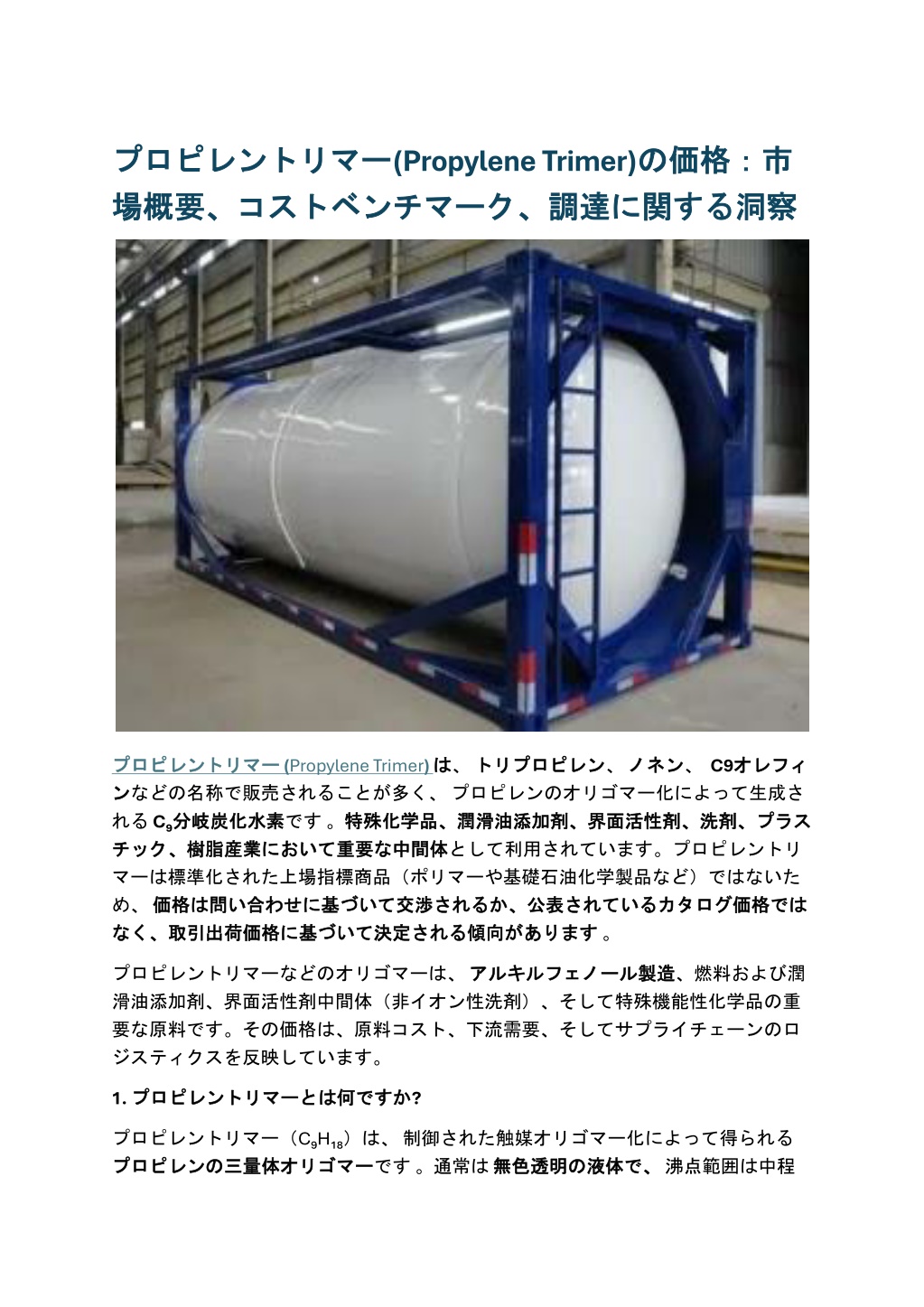 プロピレントリマー プロピレントリマー(Propylene Trimer)の 場概要、 場概要、コストベンチマーク、 コストベンチマーク、調達 の価格:市 価格:市 に関 関する する洞察 洞察 調達に プロピレントリマー プロピレントリマー (Propylene Trimer)は ン ンなどの名称で販売されることが多く、プロピレンのオリゴマー化によって生成さ れるC₉分岐炭化水素 分岐炭化水素です。特殊化学品、潤滑油添加剤、界面活性剤、洗剤、 特殊化学品、潤滑油添加剤、界面活性剤、洗剤、プラス チック、 チック、樹脂産業 樹脂産業において において重要 重要な な中間体 中間体として利用されています。プロピレントリ は、トリプロピレン トリプロピレン、ノネン ノネン、C9オレフィ オレフィ プラス マーは標準化された上場指標商品(ポリマーや基礎石油化学製品など)ではないた め、価格 価格は は問 問い い合 合わせに わせに基 基づいて づいて交渉 交渉されるか、 されるか、公表 なく、 なく、取引出荷価格 取引出荷価格に に基 基づいて づいて決定 決定される される傾向 公表されている されているカタログ があります。 カタログ価格 価格では では 傾向があります プロピレントリマーなどのオリゴマーは、アルキルフェノール 滑油添加剤、界面活性剤中間体(非イオン性洗剤)、そして特殊機能性化学品の重 アルキルフェノール製造 製造、燃料および潤 要な原料です。その価格は、原料コスト、下流需要、そしてサプライチェーンのロ ジスティクスを反映しています。 1. プロピレントリマー プロピレントリマーとは 何ですか ですか? とは何 プロピレントリマー(C₉H₁₈)は、制御された触媒オリゴマー化によって得られる プロピレン プロピレンの の三量体 三量体オリゴマー オリゴマーです。通常は無色透明 で、沸点範囲は中程 無色透明の の液体 液体で、