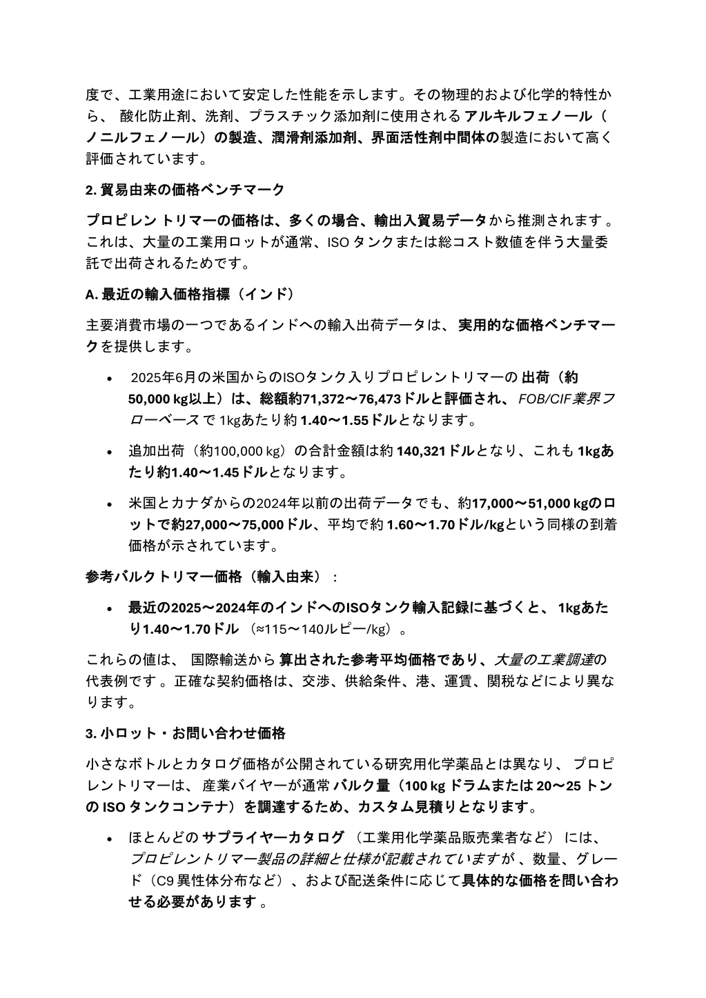 度で、工業用途において安定した性能を示します。その物理的および化学的特性か度で、工業用途において安定した性能を示します。その物理的および化学的特性か ら、酸化防止剤、洗剤、プラスチック添加剤に使用されるアルキルフェノール( ノニルフェノール) ノニルフェノール)の の製造、潤滑剤添加剤、界面活性剤中間体 製造、潤滑剤添加剤、界面活性剤中間体の 評価されています。 アルキルフェノール( の製造において高く 2. 貿易由来 貿易由来の の価格 価格ベンチマーク ベンチマーク プロピレン プロピレントリマー これは、大量の工業用ロットが通常、ISO タンクまたは総コスト数値を伴う大量委 託で出荷されるためです。 データから推測されます。 トリマーの の価格 価格は、 は、多 多くの くの場合、輸出入貿易 場合、輸出入貿易データ A. 最近 最近の インド) の輸入価格指標( 輸入価格指標(インド) 主要消費市場の一つであるインドへの輸入出荷データは、実用的 ク クを提供します。 実用的な な価格 価格ベンチマー ベンチマー •2025年6月の米国からのISOタンク入りプロピレントリマーの出荷(約 50,000 kg以上) 以上)は は、 、総額約 総額約71,372~ ローベースで1kgあたり約1.40~ ~1.55ドル 出荷(約 ~76,473ドル ドルとなります。 され、FOB/CIF業界フ ドルと と評価 評価され、 •追加出荷(約100,000 kg)の合計金額は約140,321ドル たり たり約 約1.40~ ~1.45ドル ドルとなります。 ドルとなり、これも1kgあ あ •米国とカナダからの2024年以前の出荷データでも、約17,000~ ット ットで で約 約27,000~ ~75,000ドル ドル、平均で約1.60~ 価格が示されています。 ~51,000 kgの のロ ロ ~1.70ドル ドル/kgという同様の到着 価格(輸入由来): 参考 参考バルクトリマー バルクトリマー価格(輸入由来): の2025~ ~1.70ドル ~2024年 ドル(≈115~140ルピー/kg)。 へのISOタンク 基づくと、 づくと、 1kgあた •最近 最近の り り1.40~ 年の のインド インドへの タンク輸入記録 輸入記録に に基 あた これらの値は、国際輸送から算出 代表例です。正確な契約価格は、交渉、供給条件、港、運賃、関税などにより異な ります。 算出された された参考平均価格 参考平均価格であり、 であり、大量の工業調達の 3. 小 価格 小ロット・ ロット・お お問 問い い合 合わせ わせ価格 小さなボトルとカタログ価格が公開されている研究用化学薬品とは異なり、プロピ レントリマーは、産業バイヤーが通常バルク バルク量( の の ISO タンクコンテナ) タンクコンテナ)を を調達 調達するため、 するため、カスタム 量(100 kg ドラム カスタム見積 見積りとなります または 20~ ~25 トン ドラムまたは りとなります。 トン •ほとんどのサプライヤーカタログ サプライヤーカタログ(工業用化学薬品販売業者など)には、 プロピレントリマー製品の詳細と仕様が記載されていますが、数量、グレー ド(C9 異性体分布など)、および配送条件に応じて具体的 せる せる必要 必要があります があります。 具体的な な価格 価格を を問 問い い合 合わ わ