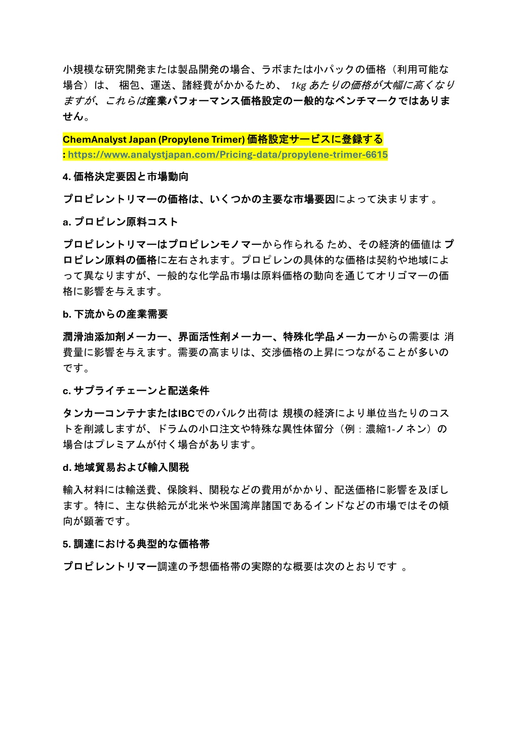 小規模な研究開発または製品開発の場合、ラボまたは小パックの価格(利用可能な小規模な研究開発または製品開発の場合、ラボまたは小パックの価格(利用可能な 場合)は、梱包、運送、諸経費がかかるため、1kg あたりの価格が大幅に高くなり ますが、これらは産業 産業パフォーマンス パフォーマンス価格設定 価格設定の せん。 の一般的 一般的な なベンチマーク ベンチマークではありま ではありま せん ChemAnalyst Japan(Propylene Trimer)価格設定 :https://www.analystjapan.com/Pricing-data/propylene-trimer-6615 価格設定サービス サービスに に登録 登録する する 4. 価格決定要因 価格決定要因と と市場動向 市場動向 な市場要因 市場要因によって決まります。 プロピレントリマー プロピレントリマーの の価格 価格は、いくつかの は、いくつかの主要 主要な a. プロピレン プロピレン原料 原料コスト コスト はプロピレンモノマー プロピレンモノマーから作られるため、その経済的価値はプ の価格 価格に左右されます。プロピレンの具体的な価格は契約や地域によ プロピレントリマー プロピレントリマーは プ ロピレン ロピレン原料 原料の って異なりますが、一般的な化学品市場は原料価格の動向を通じてオリゴマーの価 格に影響を与えます。 b. 下流 下流からの からの産業需要 産業需要 メーカーからの需要は消 潤滑油添加剤 潤滑油添加剤メーカー、 メーカー、界面活性剤 界面活性剤メーカー、 メーカー、特殊化学品 特殊化学品メーカー 費量に影響を与えます。需要の高まりは、交渉価格の上昇につながることが多いの です。 c. サプライチェーン サプライチェーンと と配送条件 配送条件 またはIBCでのバルク出荷は規模の経済により単位当たりのコス タンカーコンテナ タンカーコンテナまたは トを削減しますが、ドラムの小口注文や特殊な異性体留分(例:濃縮1-ノネン)の 場合はプレミアムが付く場合があります。 d. 地域貿易 地域貿易および および輸入関税 輸入関税 輸入材料には輸送費、保険料、関税などの費用がかかり、配送価格に影響を及ぼし ます。特に、主な供給元が北米や米国湾岸諸国であるインドなどの市場ではその傾 向が顕著です。 5. 調達 調達における における典型的 な価格帯 価格帯 典型的な プロピレントリマー プロピレントリマー調達の予想価格帯の実際的な概要は次のとおりです。