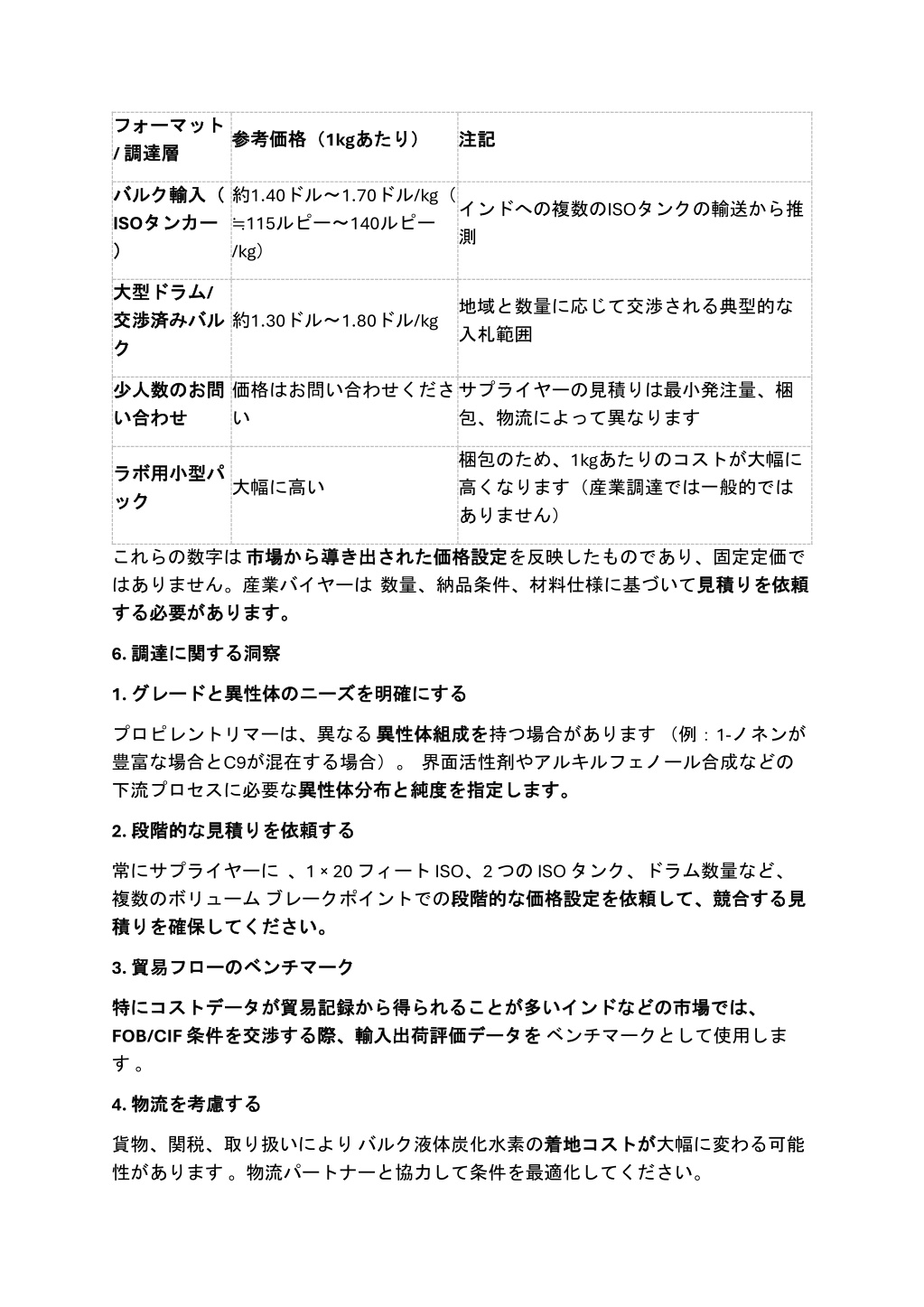 フォーマット フォーマット / 調達層 調達層 参考価格( 参考価格(1kgあたり) あたり) 注記 注記 約1.40ドル~1.70ドル/kg( ≒115ルピー~140ルピー /kg) バルク バルク輸入( ISOタンカー タンカー ) ) 輸入( インドへの複数のISOタンクの輸送から推 測 大型 大型ドラム ドラム/ 交渉済 交渉済み ク 地域と数量に応じて交渉される典型的な 入札範囲 約1.30ドル~1.80ドル/kg みバル バル ク 少人数 少人数のお わせ のお問 問 価格はお問い合わせくださ い サプライヤーの見積りは最小発注量、梱 包、物流によって異なります い い合 合わせ 梱包のため、1kgあたりのコストが大幅に 高くなります(産業調達では一般的では ありません) ラボ ラボ用小型 用小型パ ック パ 大幅に高い ック これらの数字は市場 はありません。産業バイヤーは数量、納品条件、材料仕様に基づいて見積 する する必要 必要があります。 があります。 市場から から導 導き き出 出された された価格設定 価格設定を反映したものであり、固定定価で 見積りを りを依頼 依頼 6. 調達 調達に 洞察 に関 関する する洞察 1. グレード グレードと にする と異性体 異性体の のニーズ ニーズを を明確 明確にする プロピレントリマーは、異なる異性体組成 豊富な場合とC9が混在する場合)。界面活性剤やアルキルフェノール合成などの 下流プロセスに必要な異性体分布 異性体分布と と純度 純度を を指定 を持つ場合があります(例:1-ノネンが 異性体組成を 指定します。 します。 2. 段階的 段階的な する な見積 見積りを りを依頼 依頼する 常にサプライヤーに、1 × 20 フィート ISO、2 つの ISO タンク、ドラム数量など、 複数のボリュームブレークポイントでの段階的 段階的な 積 積りを りを確保 確保してください。 してください。 な価格設定 価格設定を を依頼 依頼して、 して、競合 競合する する見 見 3. 貿易 貿易フロー のベンチマーク ベンチマーク フローの 特 特に FOB/CIF 条件 す。 にコストデータ コストデータが が貿易記録 貿易記録から から得 得られることが られることが多 多い をベンチマークとして使用しま いインド インドなどの などの市場 市場では、 では、 条件を を交渉 交渉する する際、輸入出荷評価 際、輸入出荷評価データ データを 4. 物流 物流を する を考慮 考慮する 貨物、関税、取り扱いによりバルク液体炭化水素の着地 性があります。物流パートナーと協力して条件を最適化してください。 着地コスト コストが が大幅に変わる可能