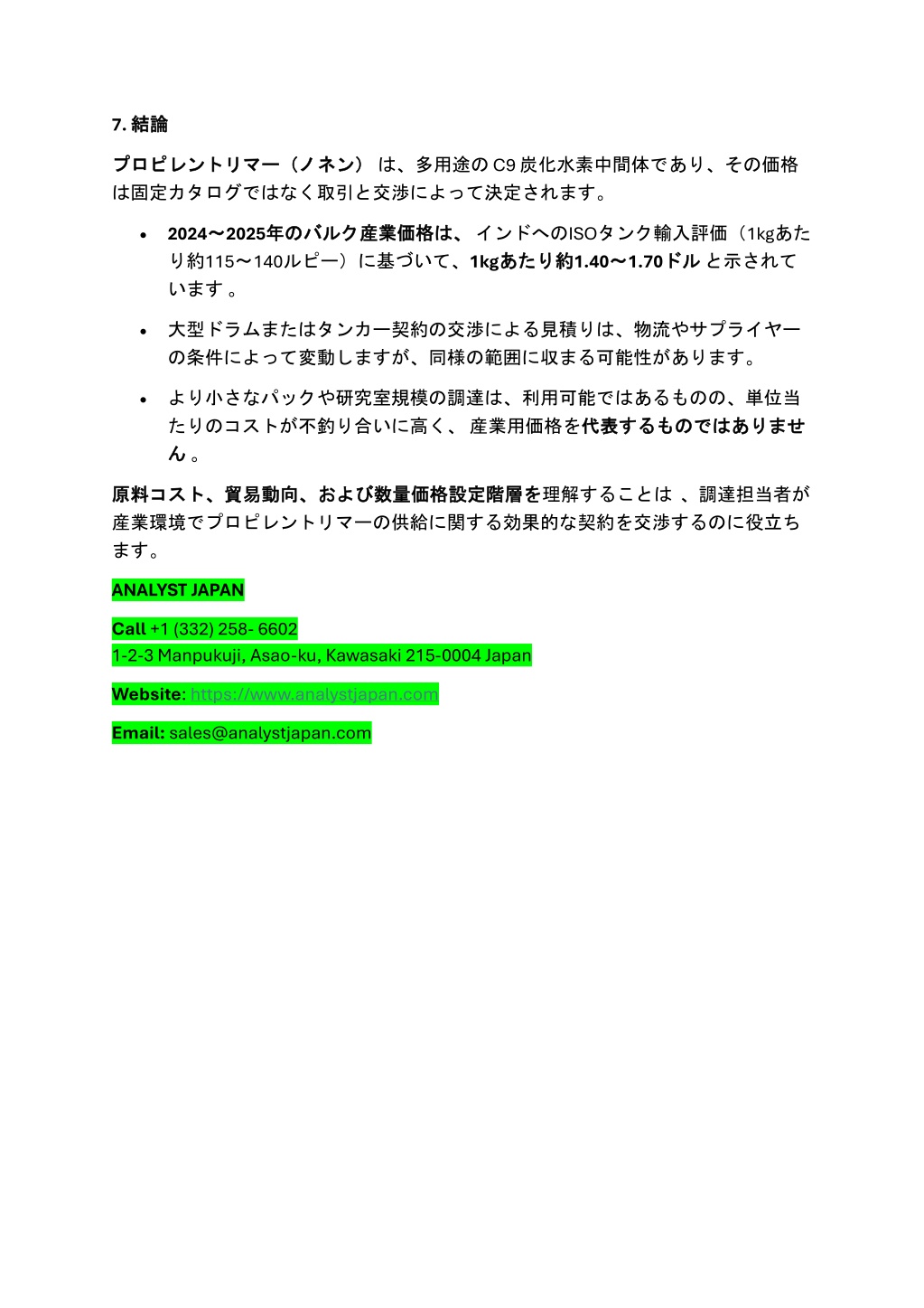 7. 結論 結論 プロピレントリマー(ノネン) プロピレントリマー(ノネン)は、多用途の C9 炭化水素中間体であり、その価格 は固定カタログではなく取引と交渉によって決定されます。 •2024~ り約115~140ルピー)に基づいて、1kgあたり います。 ~2025年 は、インドへのISOタンク輸入評価(1kgあた あたり約 約1.40~ ~1.70ドル 年の のバルク バルク産業価格 産業価格は、 ドルと示されて •大型ドラムまたはタンカー契約の交渉による見積りは、物流やサプライヤー の条件によって変動しますが、同様の範囲に収まる可能性があります。 •より小さなパックや研究室規模の調達は、利用可能ではあるものの、単位当 たりのコストが不釣り合いに高く、産業用価格を代表 ん ん。 代表するものではありませ するものではありませ を理解することは、調達担当者が 原料 原料コスト、 コスト、貿易動向、 貿易動向、および および数量価格設定階層 数量価格設定階層を 産業環境でプロピレントリマーの供給に関する効果的な契約を交渉するのに役立ち ます。 ANALYST JAPAN Call+1 (332) 258- 6602 1-2-3 Manpukuji, Asao-ku, Kawasaki 215-0004 Japan Website:https://www.analystjapan.com Email:sales@analystjapan.com