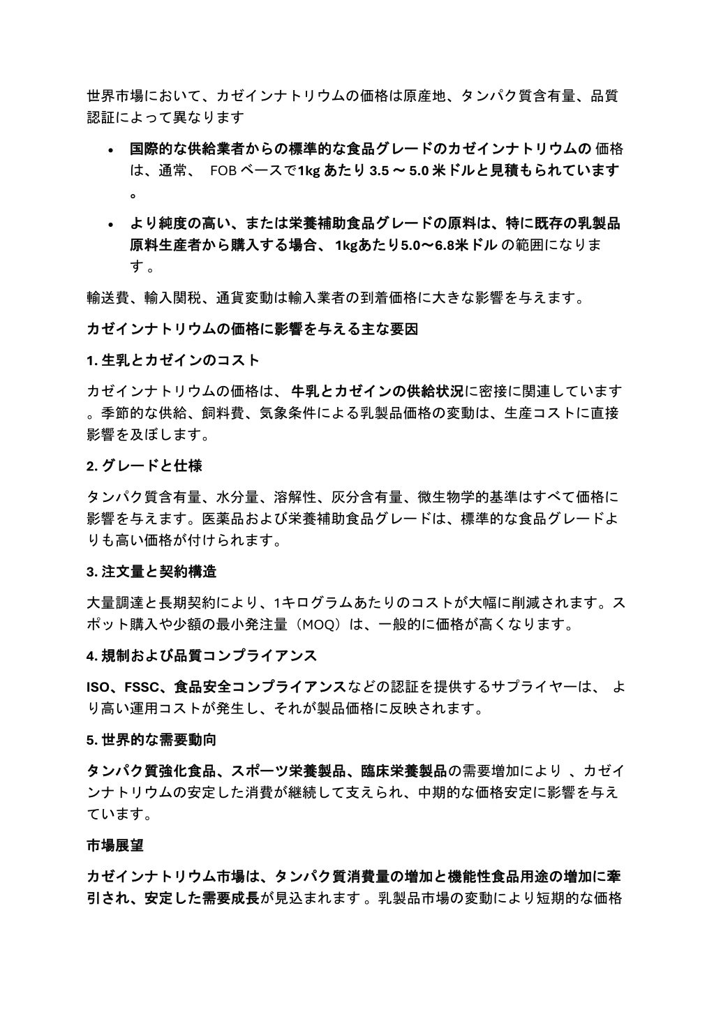 世界市場において、カゼインナトリウムの価格は原産地、タンパク質含有量、品質世界市場において、カゼインナトリウムの価格は原産地、タンパク質含有量、品質 認証によって異なります の価格 •国際的 国際的な は、通常、FOB ベースで1kg あたり 。 。 な供給業者 供給業者からの からの標準的 標準的な な食品 食品グレード グレードの あたり 3.5 ~ のカゼインナトリウム カゼインナトリウムの ~ 5.0 米 米ドル ドルと と見積 見積もられています もられています •より より純度 原料生産者 原料生産者から す。 純度の の高 高い、または い、または栄養補助食品 栄養補助食品グレード 場合、1kgあたり あたり5.0~ グレードの の原料 原料は、 ~6.8米 米ドル は、特 ドルの範囲になりま 特に に既存 既存の の乳製品 乳製品 から購入 購入する する場合、 輸送費、輸入関税、通貨変動は輸入業者の到着価格に大きな影響を与えます。 な要因 要因 カゼインナトリウム カゼインナトリウムの の価格 価格に に影響 影響を を与 与える える主 主な 1. 生乳 生乳と のコスト コスト とカゼイン カゼインの カゼインナトリウムの価格は、牛乳 。季節的な供給、飼料費、気象条件による乳製品価格の変動は、生産コストに直接 影響を及ぼします。 牛乳と とカゼイン カゼインの の供給状況 供給状況に密接に関連しています 2. グレード グレードと と仕様 仕様 タンパク質含有量、水分量、溶解性、灰分含有量、微生物学的基準はすべて価格に 影響を与えます。医薬品および栄養補助食品グレードは、標準的な食品グレードよ りも高い価格が付けられます。 3. 注文量 注文量と と契約構造 契約構造 大量調達と長期契約により、1キログラムあたりのコストが大幅に削減されます。ス ポット購入や少額の最小発注量(MOQ)は、一般的に価格が高くなります。 4. 規制 規制および 品質コンプライアンス コンプライアンス および品質 ISO、 り高い運用コストが発生し、それが製品価格に反映されます。 、FSSC、食品安全 、食品安全コンプライアンス コンプライアンスなどの認証を提供するサプライヤーは、よ 5. 世界的 世界的な な需要動向 需要動向 スポーツ栄養製品、臨床栄養製品 栄養製品、臨床栄養製品の需要増加により、カゼイ ンナトリウムの安定した消費が継続して支えられ、中期的な価格安定に影響を与え ています。 タンパク タンパク質強化食品、 質強化食品、スポーツ 市場展望 市場展望 カゼインナトリウム カゼインナトリウム市場 引 引され、 され、安定 安定した 市場は、 需要成長が見込まれます。乳製品市場の変動により短期的な価格 は、タンパク タンパク質消費量 質消費量の の増加 増加と と機能性食品用途 機能性食品用途の の増加 増加に に牽 牽 した需要成長