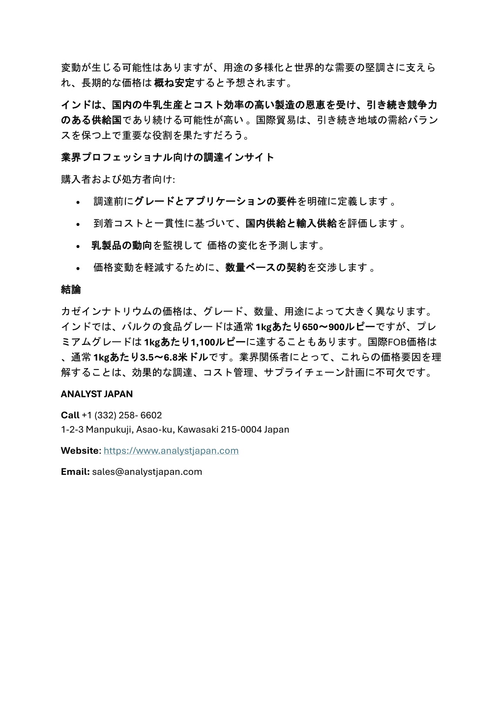 変動が生じる可能性はありますが、用途の多様化と世界的な需要の堅調さに支えら変動が生じる可能性はありますが、用途の多様化と世界的な需要の堅調さに支えら れ、長期的な価格は概 概ね ね安定 安定すると予想されます。 インド インドは、 は、国内 国内の 供給国であり続ける可能性が高い。国際貿易は、引き続き地域の需給バラン スを保つ上で重要な役割を果たすだろう。 の牛乳生産 牛乳生産と とコスト コスト効率 効率の の高 高い い製造 製造の の恩恵 恩恵を を受 受け、 け、引 引き き続 続き き競争力 競争力 のある のある供給国 調達インサイト インサイト 業界 業界プロフェッショナル プロフェッショナル向 向けの けの調達 購入者および処方者向け: •調達前にグレード の要件 要件を明確に定義します。 グレードと とアプリケーション アプリケーションの •到着コストと一貫性に基づいて、国内供給 と輸入供給 輸入供給を評価します。 国内供給と の動向 動向を監視して価格の変化を予測します。 •乳製品 乳製品の •価格変動を軽減するために、数量 の契約 契約を交渉します。 数量ベース ベースの 結論 結論 カゼインナトリウムの価格は、グレード、数量、用途によって大きく異なります。 インドでは、バルクの食品グレードは通常1kgあたり ミアムグレードは1kgあたり あたり1,100ルピー ルピーに達することもあります。国際FOB価格は 、通常1kgあたり あたり3.5~ ~6.8米 米ドル ドルです。業界関係者にとって、これらの価格要因を理 解することは、効果的な調達、コスト管理、サプライチェーン計画に不可欠です。 あたり650~ ~900ルピー ルピーですが、プレ ANALYST JAPAN Call+1 (332) 258- 6602 1-2-3 Manpukuji, Asao-ku, Kawasaki 215-0004 Japan Website:https://www.analystjapan.com Email:sales@analystjapan.com