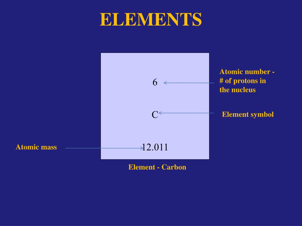 ELEMENTS 6 C 12.011 Atomic number - # of protons in the nucleus Element symbol Atomic mass Element - Carbon