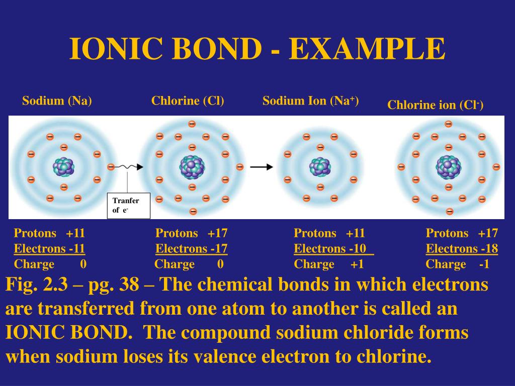 IONIC BOND - EXAMPLE Sodium (Na) Chlorine (Cl) Sodium Ion (Na+) Chlorine ion (Cl-) Tranfer of e- Protons +11 Protons +17 Protons +11 Protons +17 Electrons -11Electrons -17Electrons -10 Electrons -18 Charge 0 Charge 0 Charge +1 Charge -1 Fig. 2.3 – pg. 38 – The chemical bonds in which electrons are transferred from one atom to another is called an IONIC BOND. The compound sodium chloride forms when sodium loses its valence electron to chlorine.