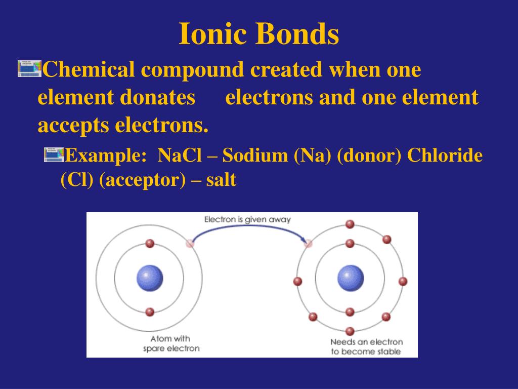 Ionic Bonds • Chemical compound created when one element donates electrons and one element accepts electrons. • Example: NaCl – Sodium (Na) (donor) Chloride (Cl) (acceptor) – salt