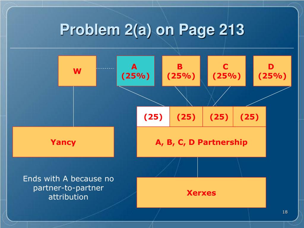 Problem 2(a) on Page 213 W A (25%) B (25%) C (25%) D (25%) (25) (25) (25) (25) Yancy A, B, C, D Partnership Ends with A because no partner-to-partner attribution Xerxes