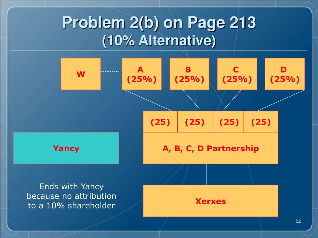 Problem 2(b) on Page 213(10% Alternative) W A (25%) B (25%) C (25%) D (25%) (25) (25) (25) (25) Yancy A, B, C, D Partnership Ends with Yancy because no attribution to a 10% shareholder Xerxes