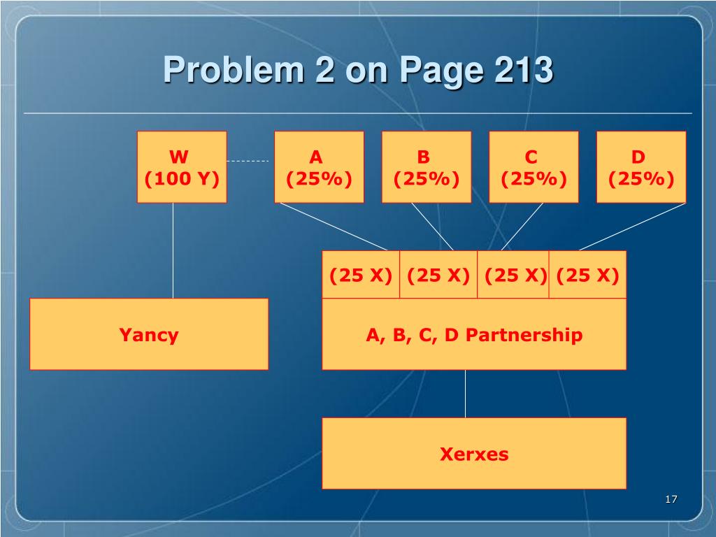 Problem 2 on Page 213 W (100 Y) A (25%) B (25%) C (25%) D (25%) (25 X) (25 X) (25 X) (25 X) Yancy A, B, C, D Partnership Xerxes
