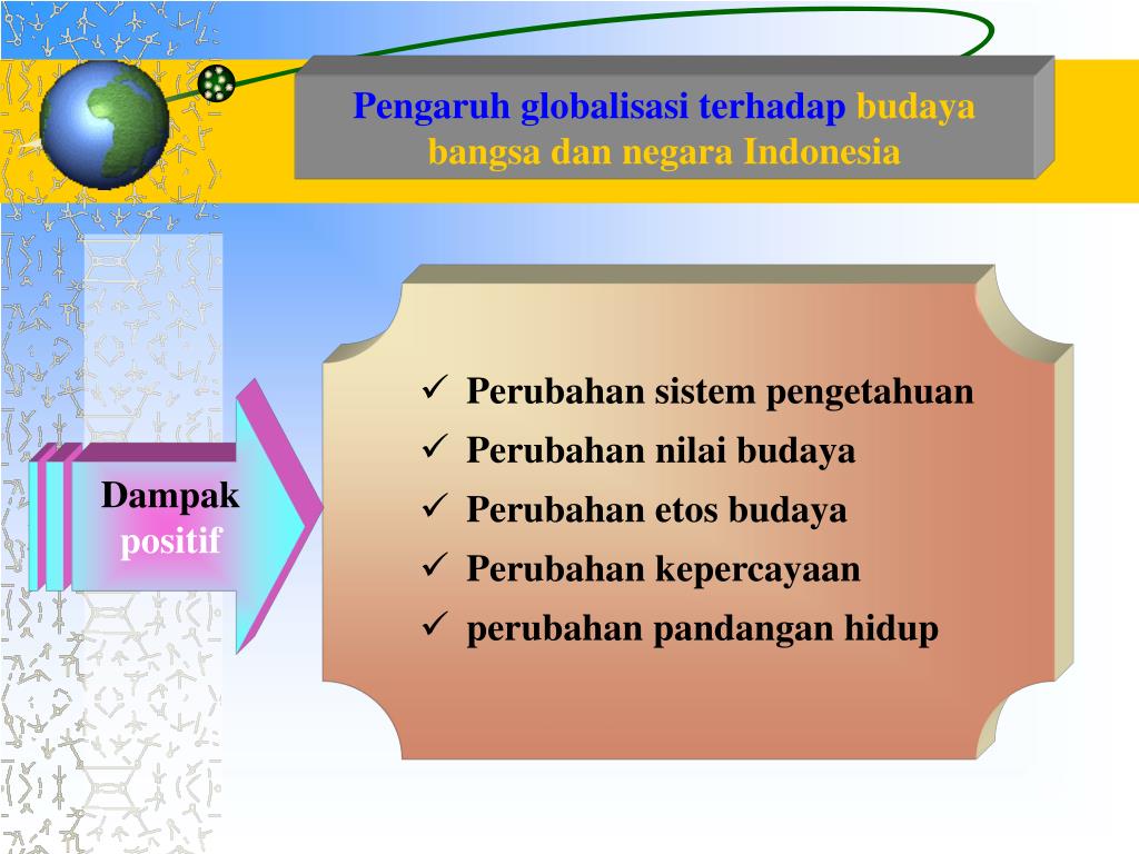 Pengaruh globalisasi terhadap budaya bangsa dan negara Indonesia • Perubahan sistem pengetahuan • Perubahan nilai budaya • Perubahan etos budaya • Perubahan kepercayaan • perubahan pandangan hidup Dampak positif