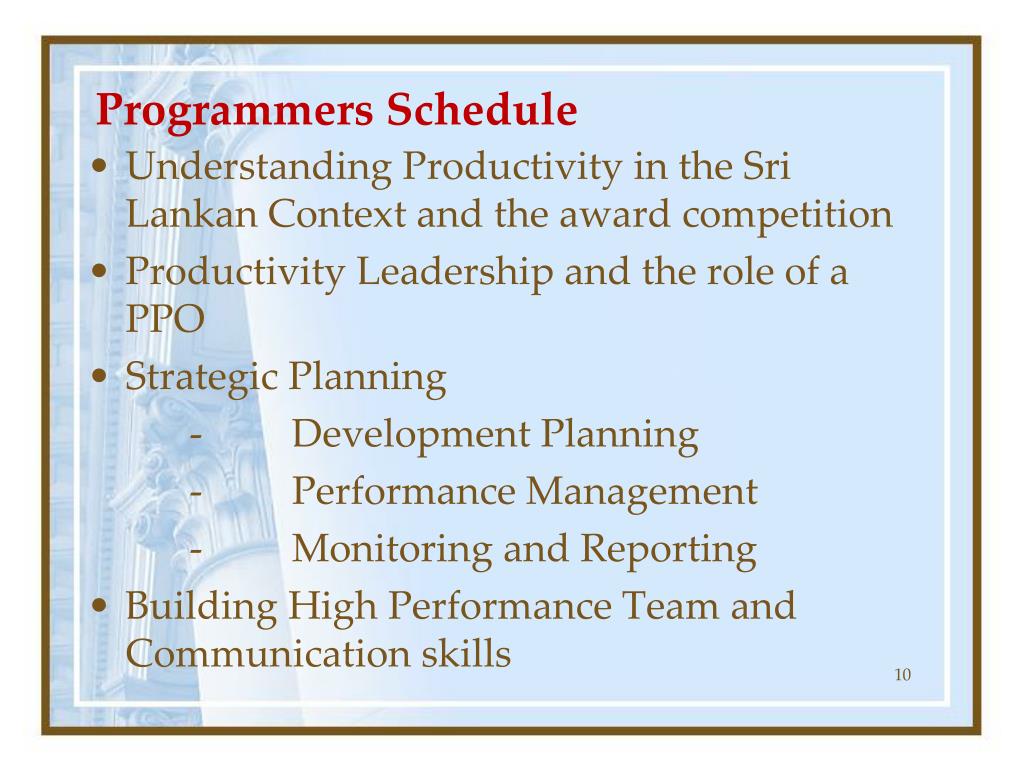 Programmers Schedule • Understanding Productivity in the Sri Lankan Context and the award competition • Productivity Leadership and the role of a PPO • Strategic Planning - Development Planning - Performance Management - Monitoring and Reporting • Building High Performance Team and Communication skills