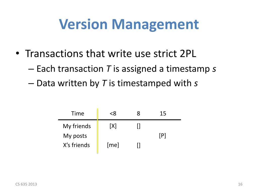 Version Management • Transactions that write use strict 2PL • Each transaction T is assigned a timestamp s • Data written by T is timestamped with s Time <8 8 15 [X] [] My friends [P] My posts [me] X’s friends []