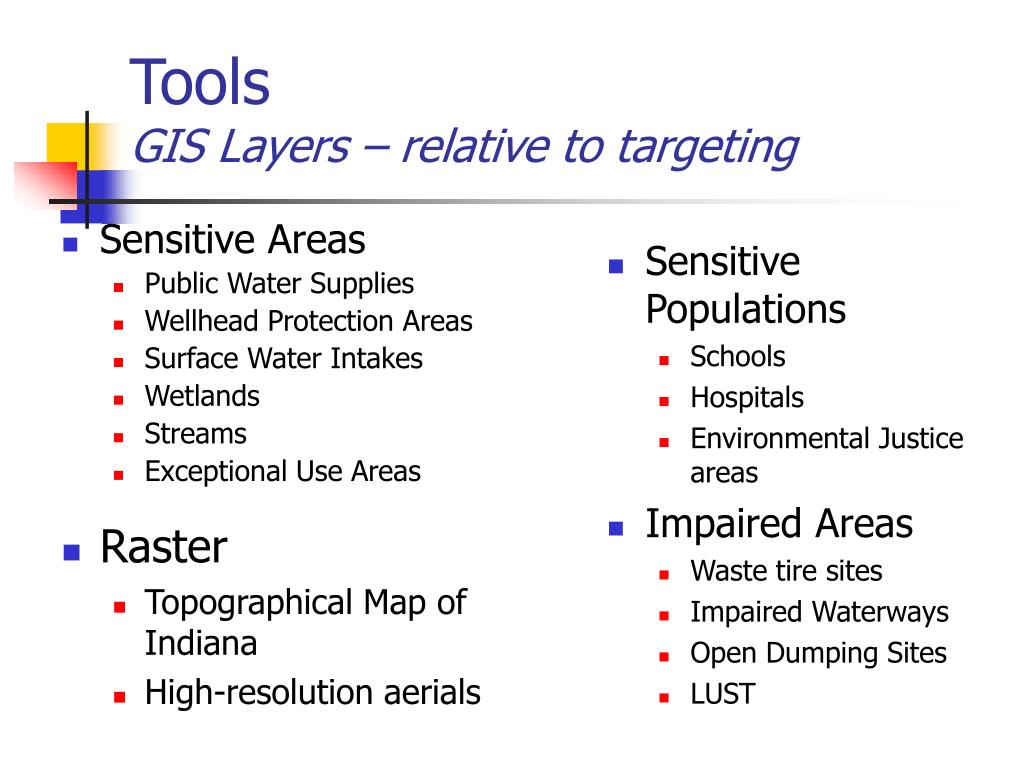 Raster Topographical Map of Indiana High-resolution aerials Sensitive Populations Schools Hospitals Environmental Justice areas Impaired Areas Waste tire sites Impaired Waterways Open Dumping Sites LUST Tools GIS Layers – relative to targeting • Sensitive Areas • Public Water Supplies • Wellhead Protection Areas • Surface Water Intakes • Wetlands • Streams • Exceptional Use Areas
