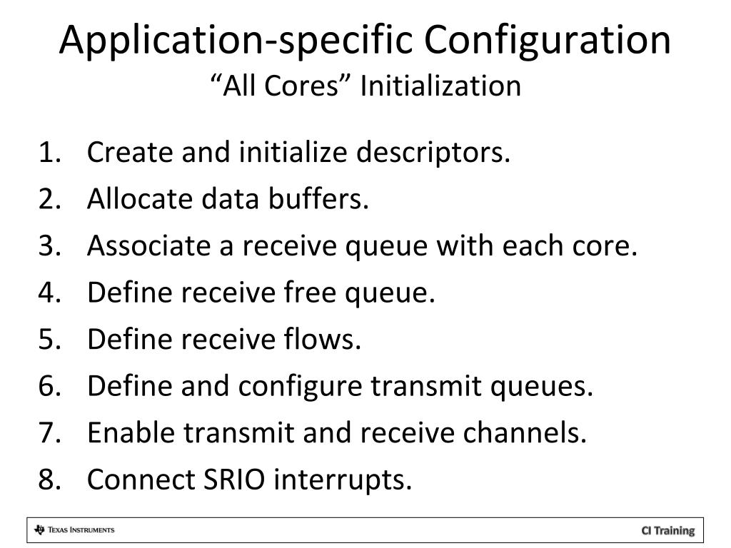 Application-specific Configuration “All Cores” Initialization Create and initialize descriptors. Allocate data buffers. Associate a receive queue with each core. Define receive free queue. Define receive flows. Define and configure transmit queues. Enable transmit and receive channels. Connect SRIO interrupts.