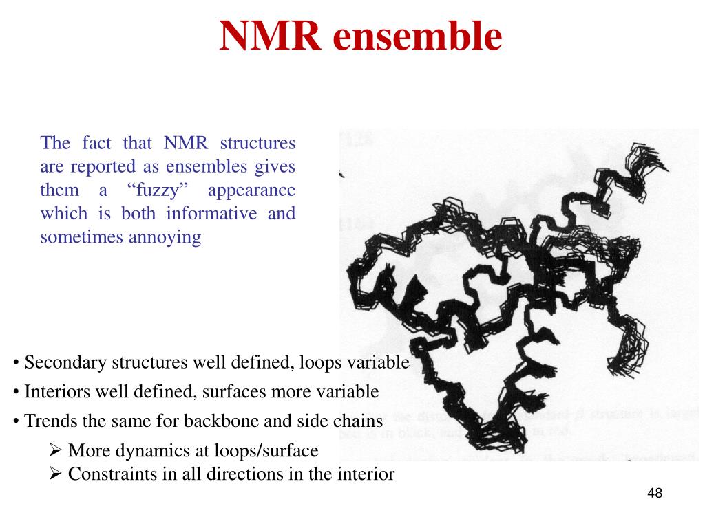 NMR ensemble The fact that NMR structures are reported as ensembles gives them a “fuzzy” appearance which is both informative and sometimes annoying • Secondary structures well defined, loops variable • Interiors well defined, surfaces more variable • Trends the same for backbone and side chains • More dynamics at loops/surface • Constraints in all directions in the interior