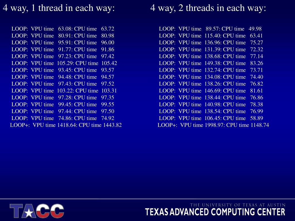 4 way, 1 thread in each way: LOOP: VPU time 63.08: CPU time 63.72 LOOP: VPU time 80.91: CPU time 80.98 LOOP: VPU time 95.91: CPU time 96.00 LOOP: VPU time 91.77: CPU time 91.86 LOOP: VPU time 97.23: CPU time 97.42 LOOP: VPU time 105.29: CPU time 105.42 LOOP: VPU time 93.45: CPU time 93.57 LOOP: VPU time 94.48: CPU time 94.57 LOOP: VPU time 97.43: CPU time 97.52 LOOP: VPU time 103.22: CPU time 103.31 LOOP: VPU time 97.28: CPU time 97.35 LOOP: VPU time 99.45: CPU time 99.55 LOOP: VPU time 97.44: CPU time 97.50 LOOP: VPU time 74.86: CPU time 74.92 LOOP+: VPU time 1418.64: CPU time 1443.82 4 way, 2 threads in each way: LOOP: VPU time 89.57: CPU time 49.98 LOOP: VPU time 115.40: CPU time 63.41 LOOP: VPU time 136.96: CPU time 75.27 LOOP: VPU time 131.39: CPU time 72.32 LOOP: VPU time 138.68: CPU time 77.14 LOOP: VPU time 149.38: CPU time 83.26 LOOP: VPU time 132.74: CPU time 73.71 LOOP: VPU time 134.08: CPU time 74.40 LOOP: VPU time 138.26: CPU time 76.82 LOOP: VPU time 146.69: CPU time 81.61 LOOP: VPU time 138.44: CPU time 76.86 LOOP: VPU time 140.98: CPU time 78.38 LOOP: VPU time 138.54: CPU time 76.99 LOOP: VPU time 106.45: CPU time 58.89 LOOP+: VPU time 1998.97: CPU time 1148.74