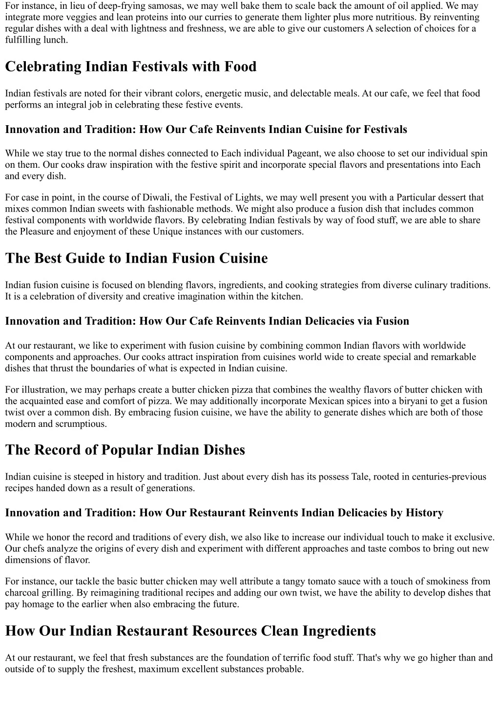 organic and natural and sustainable procedures. For example, we might use natural and organic spices, veggies, and meats within our dishes making sure that These are as clean and nutritious as possible. We may provide A variety of natural and organic options on our menu for purchasers who prioritize sustainability and healthfulness. By incorporating natural and organic substances into our Delicacies, we have the ability to create dishes that not just taste wonderful but in addition guidance the effectively-currently being of our clients as well as the Earth. How Our Restaurant Produces a Family-Pleasant Atmosphere At our restaurant, we believe in developing a warm and welcoming ecosystem wherever households can come alongside one another to get pleasure from scrumptious foodstuff and make Long lasting Reminiscences. Innovation and Custom: How Our Restaurant Reinvents Indian Cuisine for Families While our concentrate is on creating ground breaking and scrumptious dishes, we also realize the value of catering to households. We offer a range of options for kids, together with child-welcoming variations of typical Indian dishes. For case in point, as an alternative to a spicy curry, we may perhaps give you a milder Variation with acquainted flavors that kids will adore. We could also generate interactive eating activities like Do-it-yourself dosa stations or make-your- have chaat bars. By making a family-welcoming atmosphere, we have the ability to give an pleasing eating practical experience for attendees of all ages. The Best Indian Dishes for a Festive Feast Indian Delicacies is great for festive occasions as it offers a wide array of flavors and dishes which are certain to impress your visitors. At our cafe, we offer a range of choices for those seeking to rejoice in fashion. Innovation and Custom: How Our Cafe Reinvents Indian Cuisine for Festive Feasts While regular Indian dishes are by now ideal for festive events, we prefer to increase our possess touch to generate them actually unforgettable. Our chefs concentrate on building dishes that aren't only tasty but also visually amazing and distinctive. For case in point, as an alternative to a traditional buffet-fashion feast, we may possibly give you a chef's tasting menu that showcases An array of flavors and displays. We may additionally produce themed menus that highlight the festive flavors of certain areas or festivals. By reinventing regular dishes for festive feasts, we can generate dining experiences that happen to be equally celebratory and unforgettable. Exploring the Variety of Indian Beverages Indian cuisine gives an unbelievable range of beverages that range between refreshing teas and lassis to aromatic cocktails and spiced punches. At our restaurant, we celebrate this diversity by featuring an array of common Indian beverages. Innovation and Custom: How Our Restaurant Reinvents Indian Cuisine by way of Beverages While we remain legitimate for the genuine flavors and recipes of every beverage, we also prefer to set our own twist on them. Our mixologists experiment with various substances, flavor combos, and presentations to generate distinctive and remarkable beverages. For illustration, rather than a standard masala chai, we may well provide a chilly-brewed version with hints of vanilla or lavender. We could also create signature cocktails impressed by classic Indian flavors like mango or cardamom. By reinventing standard beverages, we are able to offer you our consumers A variety of selections that rejoice the diversity of Indian cuisine. How to Enjoy Indian Food using a Twist