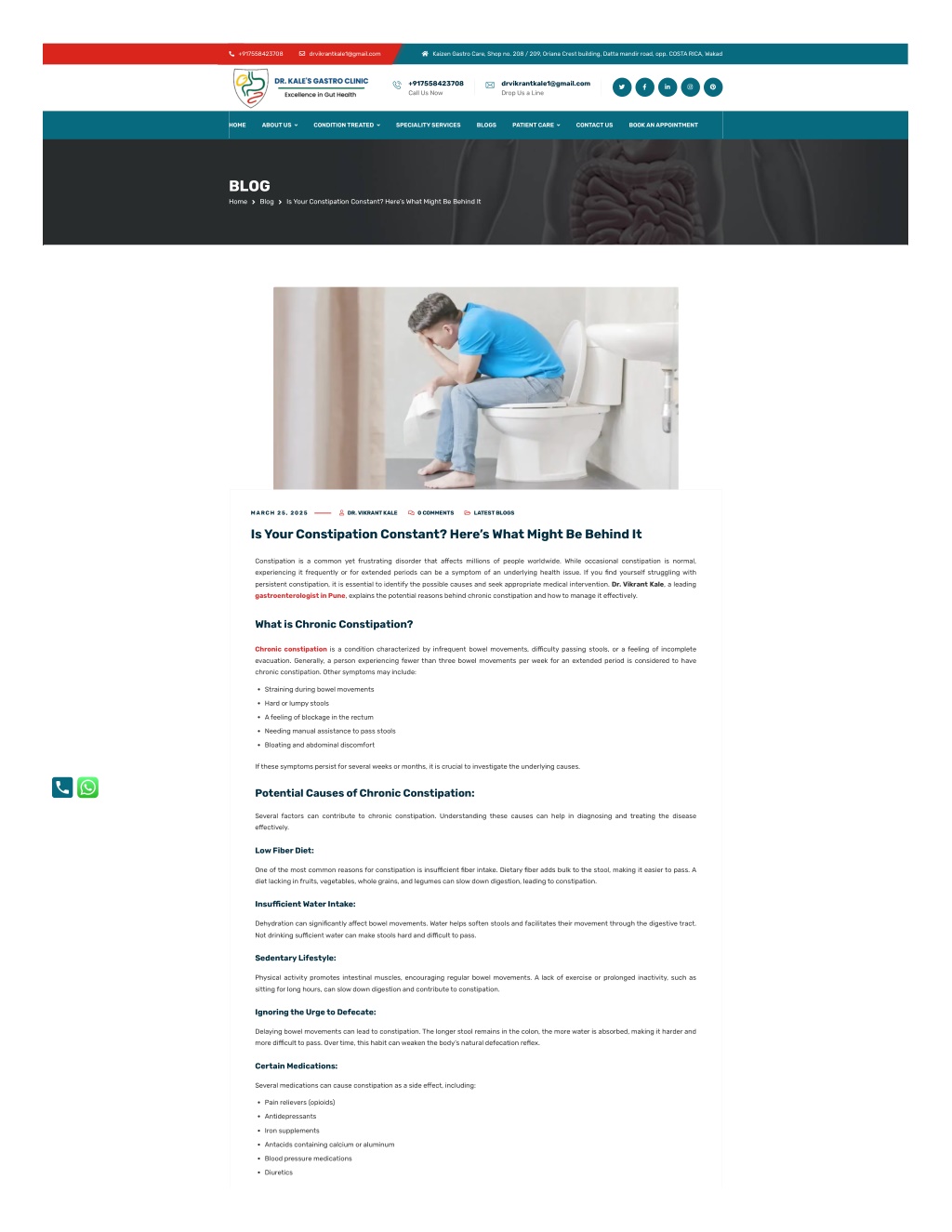drvikrantkale1@gmail.com Kaizen Gastro Care, Shop no. 208 / 209, Oriana Crest building, Datta mandir road, opp. COSTA RICA, Wakad +917558423708 +917558423708 Call Us Now drvikrantkale1@gmail.com Drop Us a Line HOME ABOUT US CONDITION TREATED SPECIALITY SERVICES BLOGS PATIENT CARE CONTACT US BOOK AN APPOINTMENT BLOG Home Blog Is Your Constipation Constant? Here’s What Might Be Behind It DR. VIKRANT KALE 0 COMMENTS LATEST BLOGS MARCH 25, 2025 Is Your Constipation Constant? Here’s What Might Be Behind It Constipation is a common yet frustrating disorder that a?ects millions of people worldwide. While occasional constipation is normal, experiencing it frequently or for extended periods can be a symptom of an underlying health issue. If you ?nd yourself struggling with persistent constipation, it is essential to identify the possible causes and seek appropriate medical intervention. Dr. Vikrant Kale, a leading gastroenterologist in Pune, explains the potential reasons behind chronic constipation and how to manage it e?ectively. What is Chronic Constipation? Chronic constipation is a condition characterized by infrequent bowel movements, di?culty passing stools, or a feeling of incomplete evacuation. Generally, a person experiencing fewer than three bowel movements per week for an extended period is considered to have chronic constipation. Other symptoms may include: Straining during bowel movements Hard or lumpy stools A feeling of blockage in the rectum Needing manual assistance to pass stools Bloating and abdominal discomfort If these symptoms persist for several weeks or months, it is crucial to investigate the underlying causes. Potential Causes of Chronic Constipation: Several factors can contribute to chronic constipation. Understanding these causes can help in diagnosing and treating the disease e?ectively. Low Fiber Diet: One of the most common reasons for constipation is insu?cient ?ber intake. Dietary ?ber adds bulk to the stool, making it easier to pass. A diet lacking in fruits, vegetables, whole grains, and legumes can slow down digestion, leading to constipation. Insu?cient Water Intake: Dehydration can signi?cantly a?ect bowel movements. Water helps soften stools and facilitates their movement through the digestive tract. Not drinking su?cient water can make stools hard and di?cult to pass. Sedentary Lifestyle: Physical activity promotes intestinal muscles, encouraging regular bowel movements. A lack of exercise or prolonged inactivity, such as sitting for long hours, can slow down digestion and contribute to constipation. Ignoring the Urge to Defecate: Delaying bowel movements can lead to constipation. The longer stool remains in the colon, the more water is absorbed, making it harder and more di?cult to pass. Over time, this habit can weaken the body’s natural defecation re?ex. Certain Medications: Several medications can cause constipation as a side e?ect, including: Pain relievers (opioids) Antidepressants Iron supplements Antacids containing calcium or aluminum Blood pressure medications Diuretics