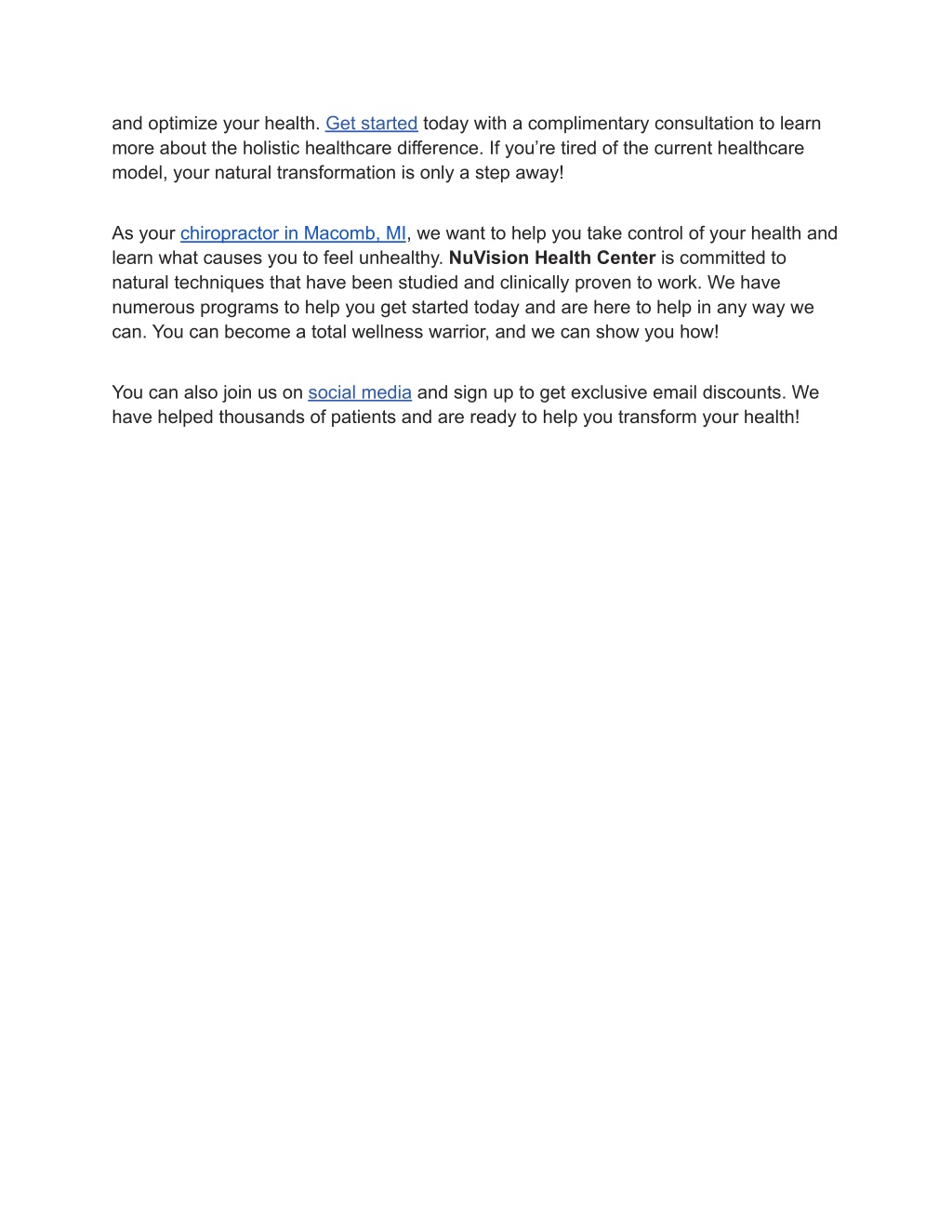 and optimize your health. Get started today with a complimentary consultation to learn more about the holistic healthcare difference. If you’re tired of the current healthcare model, your natural transformation is only a step away! As your chiropractor in Macomb, MI, we want to help you take control of your health and learn what causes you to feel unhealthy. NuVision Health Center is committed to natural techniques that have been studied and clinically proven to work. We have numerous programs to help you get started today and are here to help in any way we can. You can become a total wellness warrior, and we can show you how! You can also join us on social media and sign up to get exclusive email discounts. We have helped thousands of patients and are ready to help you transform your health!