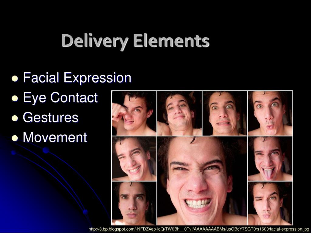 Delivery Elements • Facial Expression • Eye Contact • Gestures • Movement http://3.bp.blogspot.com/-NFDZ4ep-ioQ/TW0Bh__0TvI/AAAAAAAABMs/usOBcY7SGT0/s1600/facial-expression.jpg