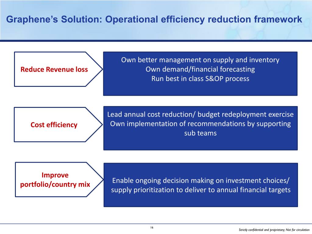 Graphene’s Solution: Operational efficiency reduction framework Reduce Revenue loss Own better management on supply and inventory Own demand/financial forecasting Run best in class S&OP process Lead annual cost reduction/ budget redeployment exercise Own implementation of recommendations by supporting sub teams Cost efficiency Improve portfolio/country mix Enable ongoing decision making on investment choices/ supply prioritization to deliver to annual financial targets