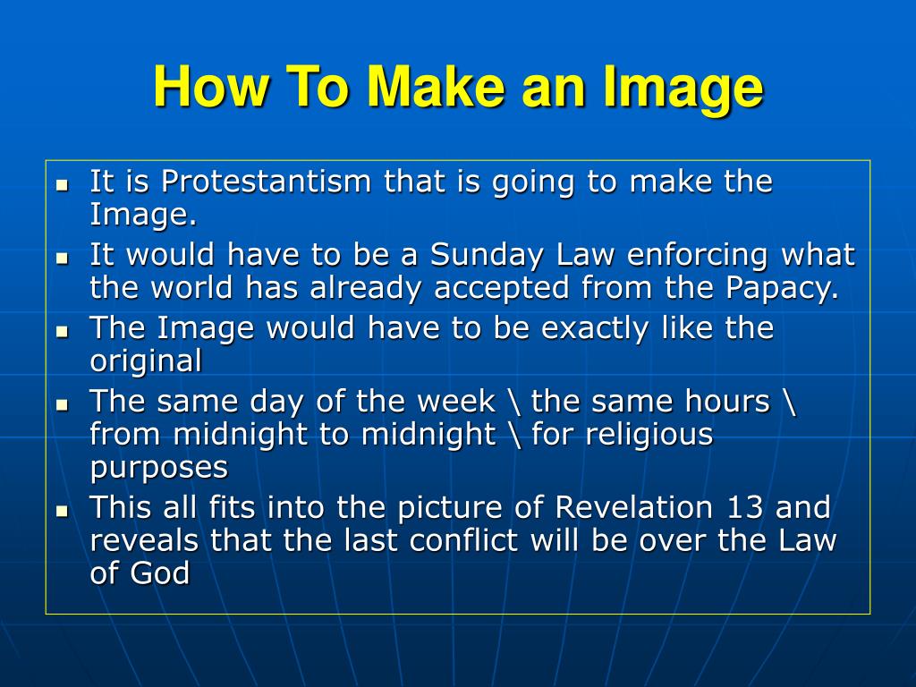 How To Make an Image • It is Protestantism that is going to make the Image. • It would have to be a Sunday Law enforcing what the world has already accepted from the Papacy. • The Image would have to be exactly like the original • The same day of the week \ the same hours \ from midnight to midnight \ for religious purposes • This all fits into the picture of Revelation 13 and reveals that the last conflict will be over the Law of God