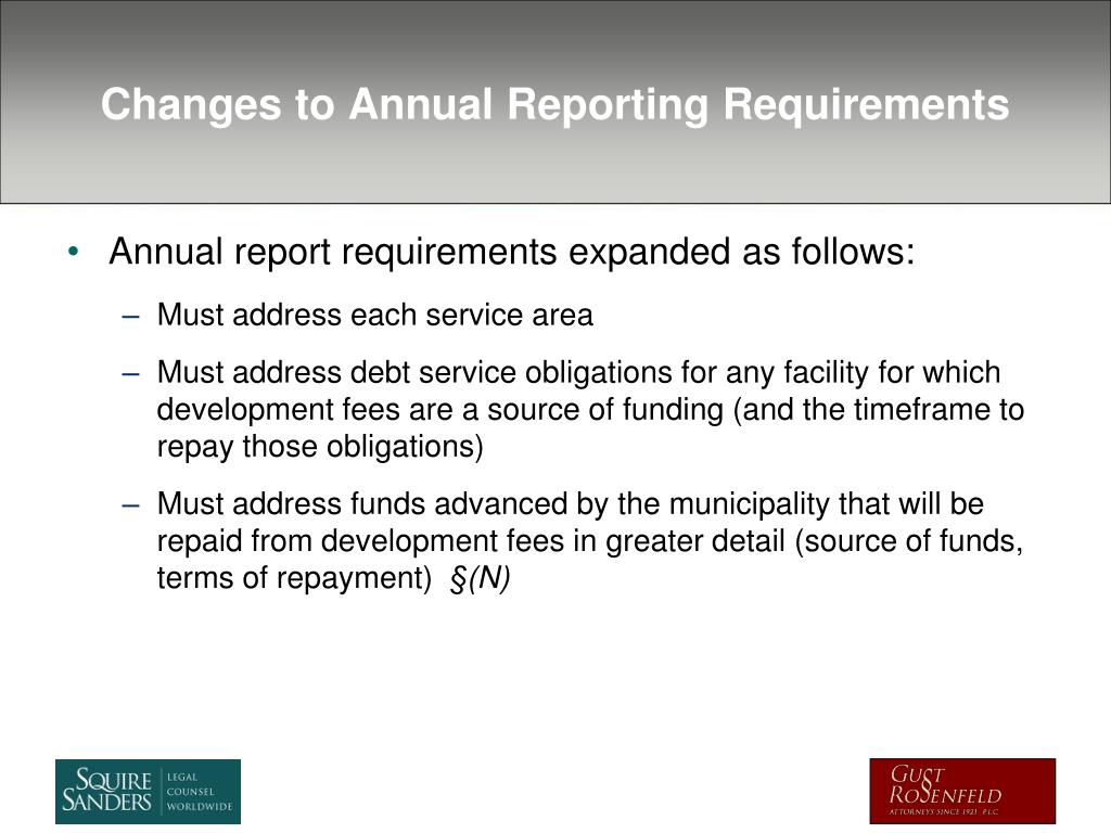 Changes to Annual Reporting Requirements • Annual report requirements expanded as follows: • Must address each service area • Must address debt service obligations for any facility for which development fees are a source of funding (and the timeframe to repay those obligations) • Must address funds advanced by the municipality that will be repaid from development fees in greater detail (source of funds, terms of repayment) §(N)
