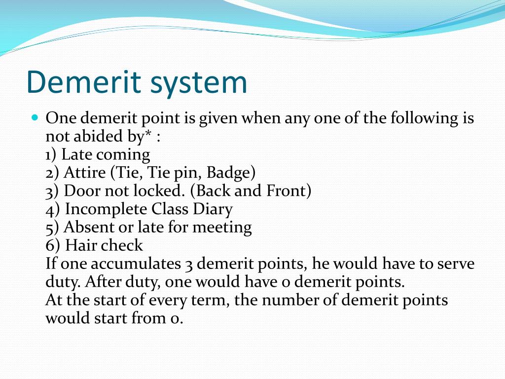 Demerit system • One demerit point is given when any one of the following is not abided by* :1) Late coming2) Attire (Tie, Tie pin, Badge)3) Door not locked. (Back and Front)4) Incomplete Class Diary5) Absent or late for meeting6) Hair checkIf one accumulates 3 demerit points, he would have to serve duty. After duty, one would have 0 demerit points.At the start of every term, the number of demerit points would start from 0.