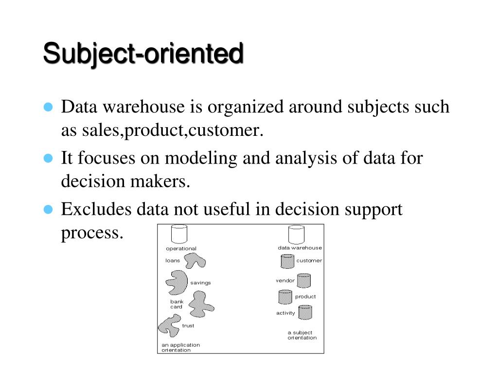 Subject-oriented • Data warehouse is organized around subjects such as sales,product,customer. • It focuses on modeling and analysis of data for decision makers. • Excludes data not useful in decision support process.